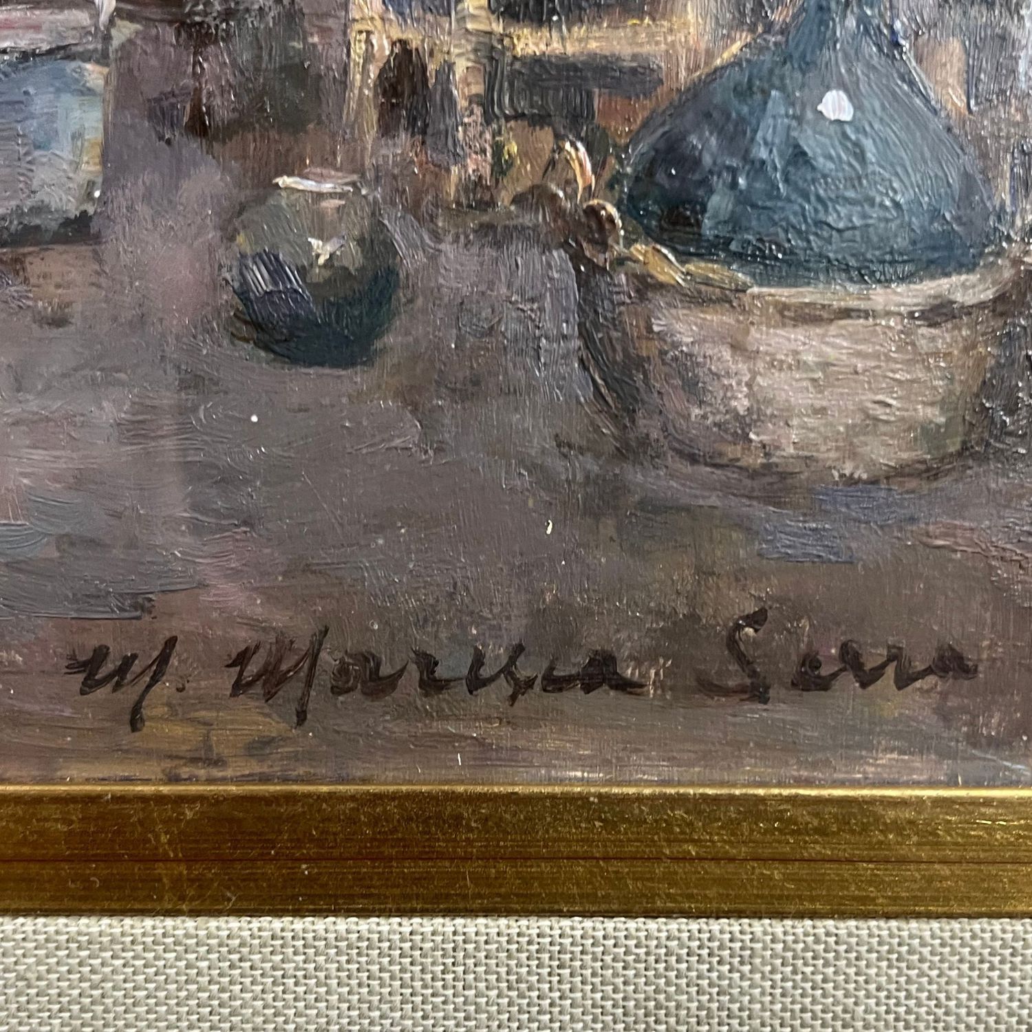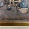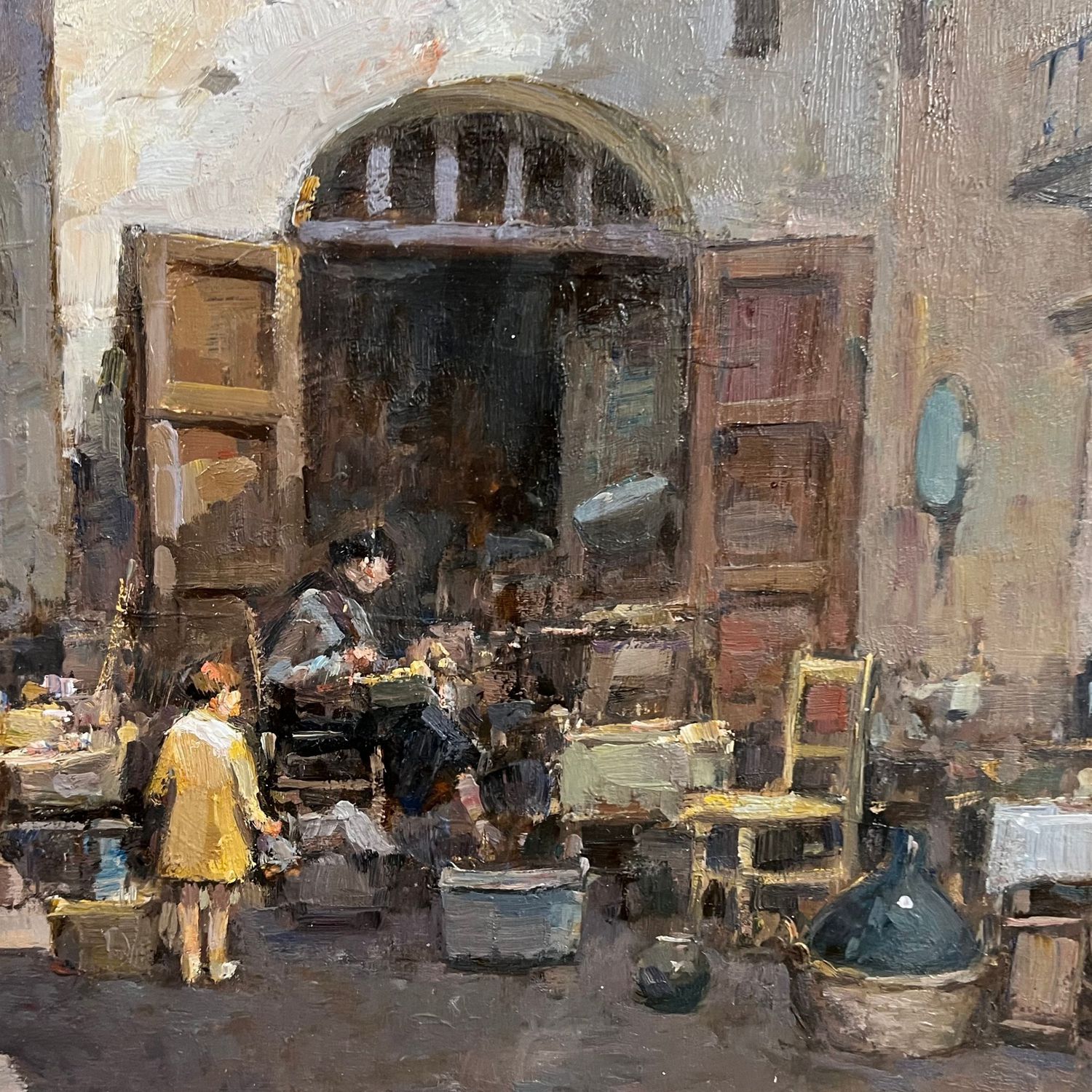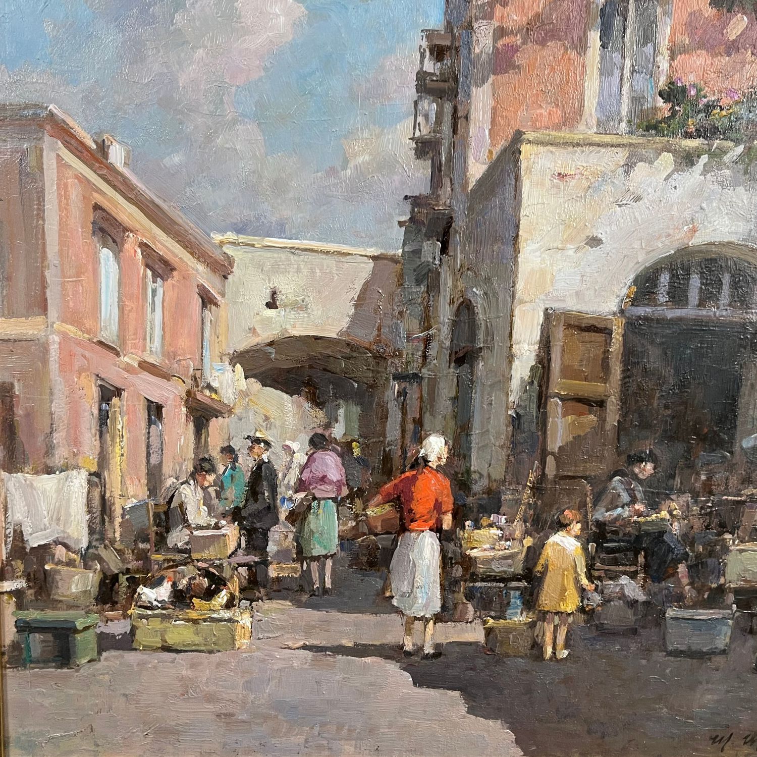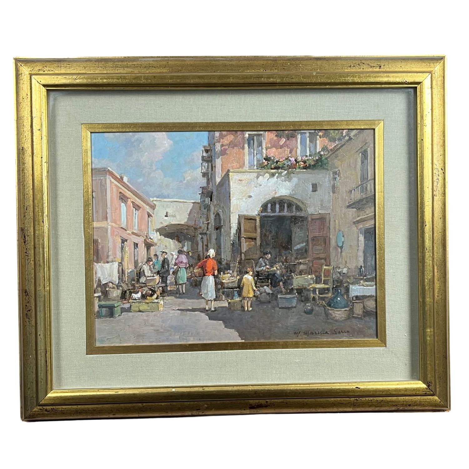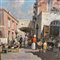 Dipinto olio su tavola, periodo XX secolo, raffigurante Scena di Mercatino.