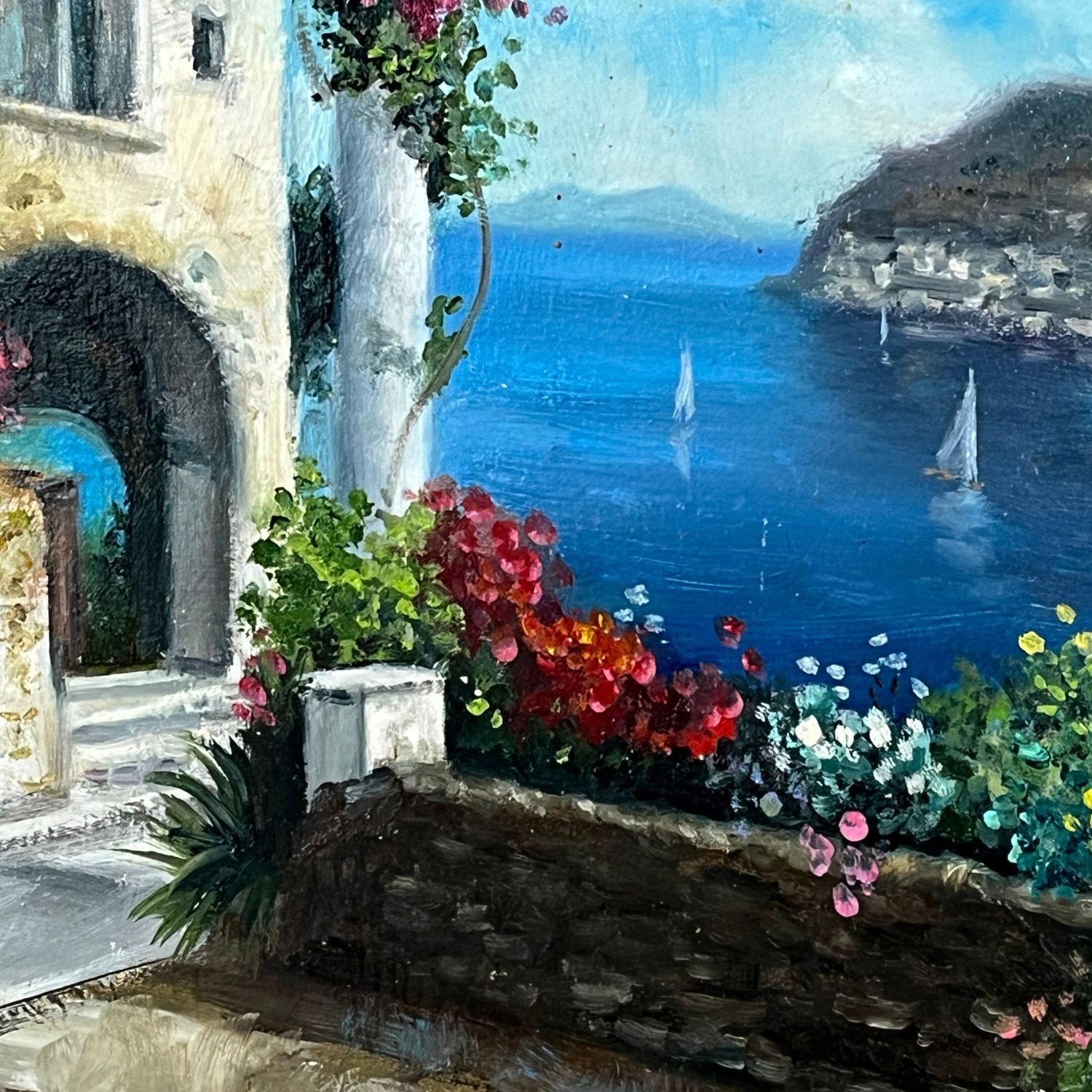 Dipinto olio su cartoncino, di forma ovale, raffigurante Veduta di Costiera da una terrazza. Scuola Italiana XX secolo. Artista anonimo.