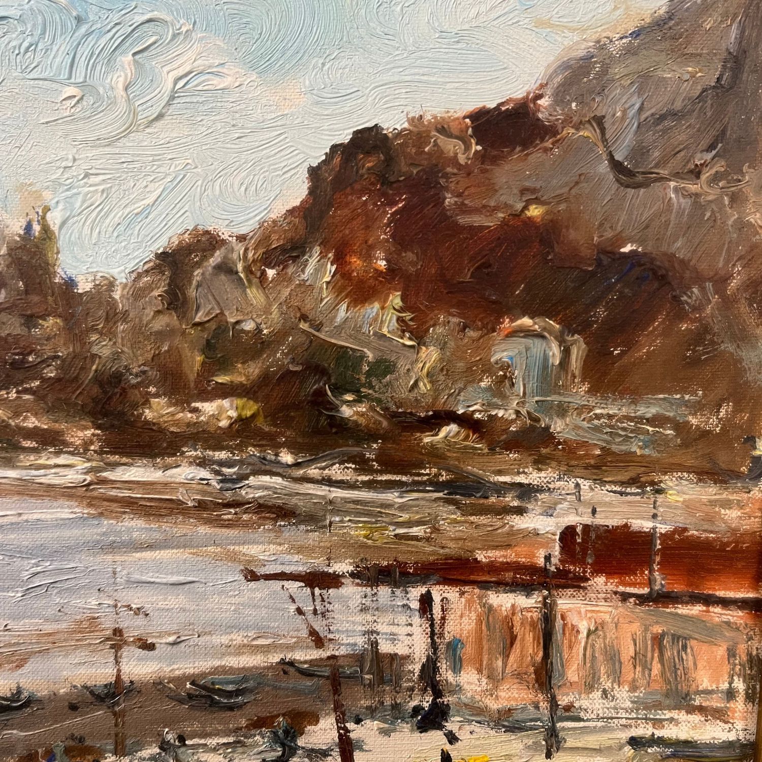 Dipinto olio su pannello, periodo XX secolo scuola Italiana, raffigurante Scorcio di marina di Montedoro.
