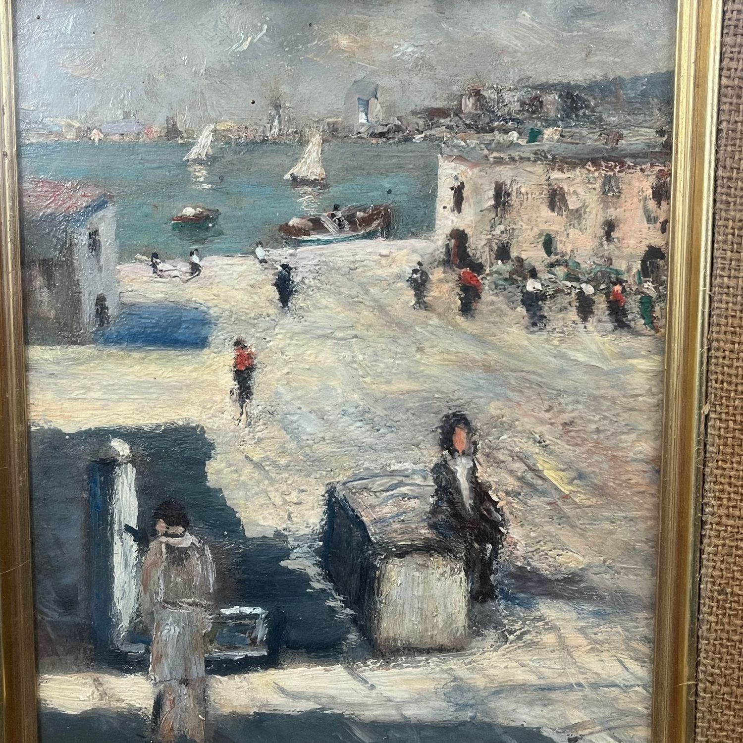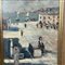 Dipinto olio su pannello, periodo XX secolo, raffigurante Marina con personaggi e barche.