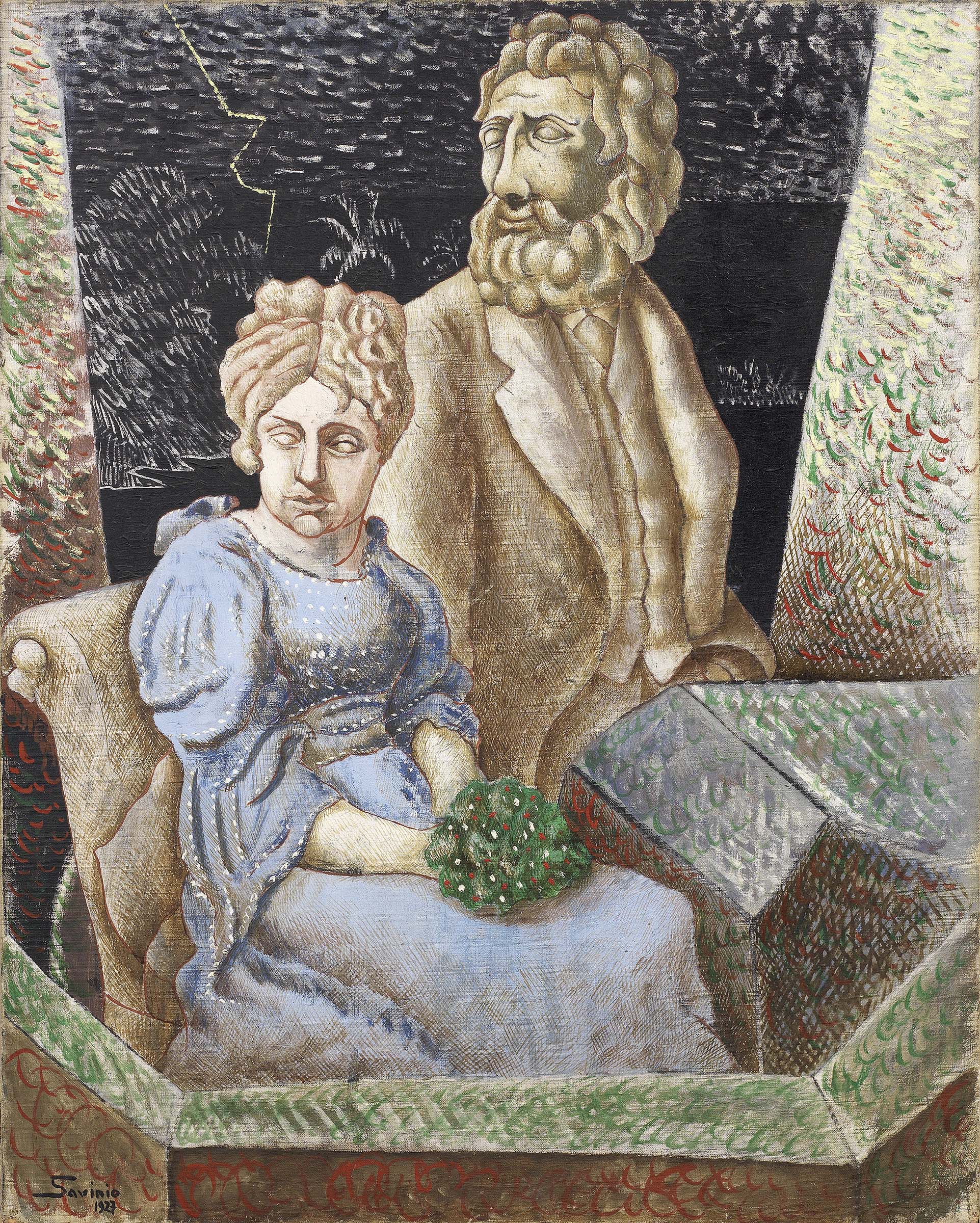 Alberto Savinio Atene 1891 - Roma 1952 Senza titolo - Figure, 1927 Olio su tela, cm. 92,3x73,3 Firma e data in basso a sinistra: Savinio / 1927; numero e data sul telaio: n. 27 1927. Storia: Galleria Gissi, Torino; Galleria Toninelli, Milano; Collezione privata, Roma Bibliografia: Daniela Fonti, Pia Vivarelli, Maurizio Fagiolo dell'Arco, Alberto Savinio, catalogo della mostra, Roma, Palazzo delle Esposizioni, 18 maggio - 18 luglio, De Luca Editore, 1978, p. 87; Pia Vivarelli, Luigi Cavallo, Savinio, disegni immaginati (1925-1932), catalogo della mostra, Galleria Tega, Milano, ottobre 1984, p. 104; Maurizio Fagiolo dell'Arco, Alberto Savinio, Fabbri Editore, Milano, 1989, p. 80, n. 5 (con titolo «Famiglia, II»); Pia Vivarelli, Savinio, gli anni di Parigi, dipinti 1927-1932, catalogo della mostra, Verona, Palazzo Forti e Galleria dello Scudo, 9 dicembre 1990 - 10 febbraio 1991, Electa, Milano, 1990, p. 132; Pia Vivarelli, Alberto Savinio. Catalogo generale, Electa, Milano, 1996, p. 35, n. 1927 15.