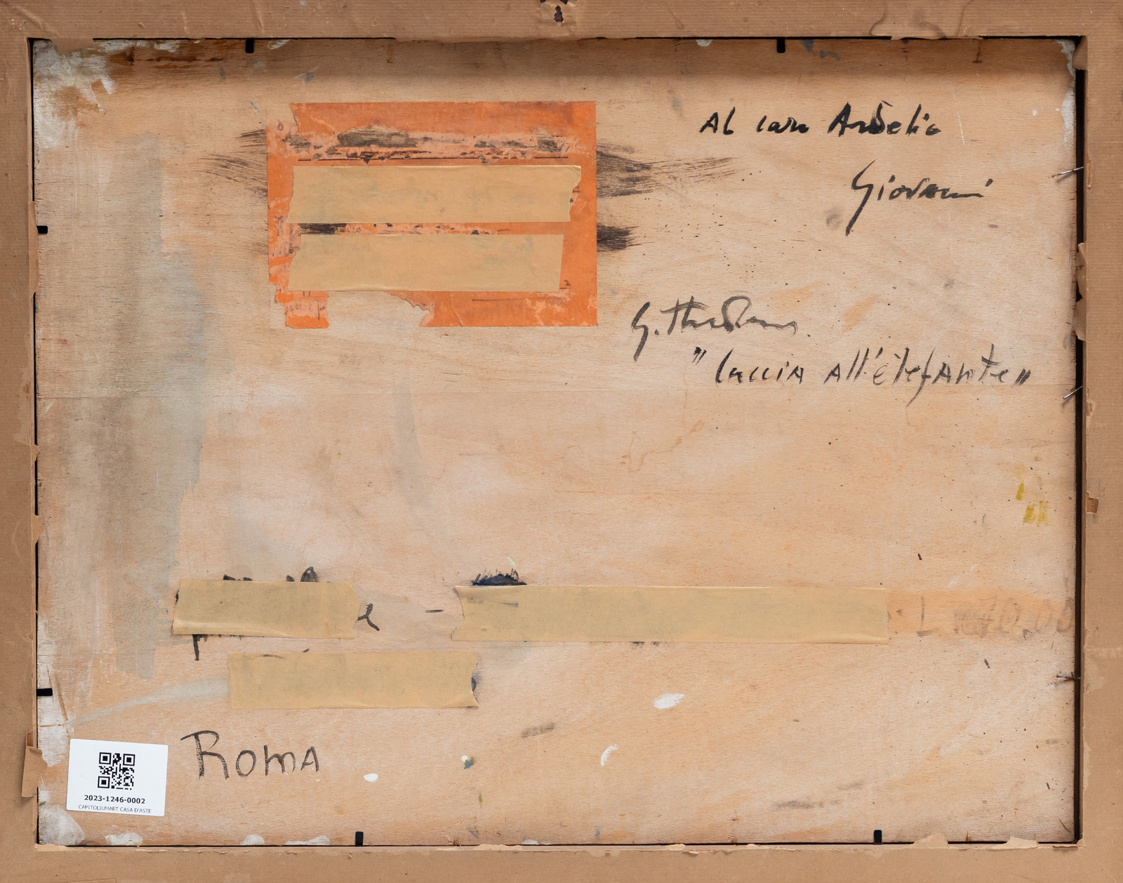 STRADONE GIOVANNI (1911 - 1981) CACCIA ALL'ELEFANTE. olio su tavola. Cm 55,00 x 42,50. sul retro: titolo, firma e dedica ad personam