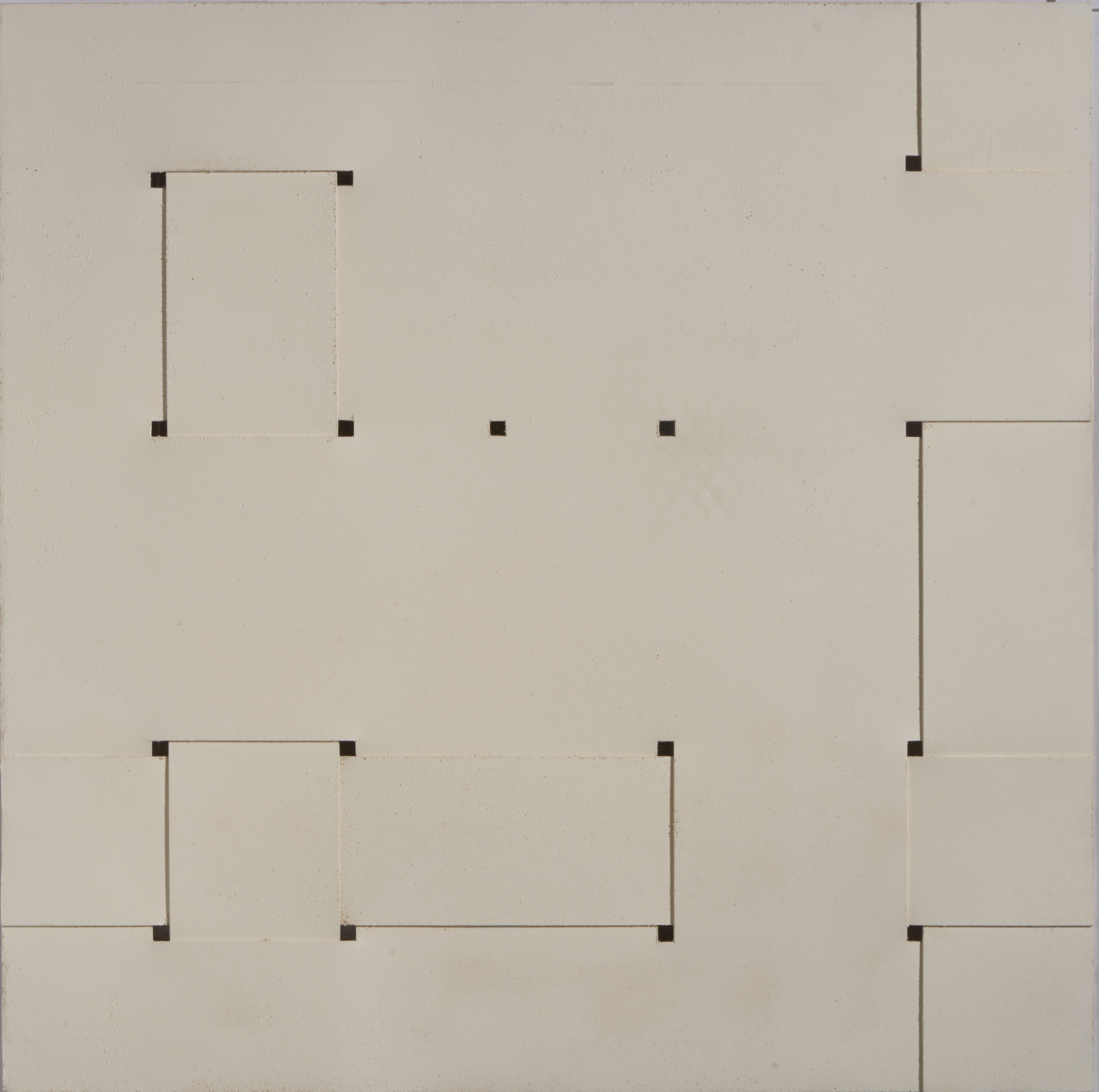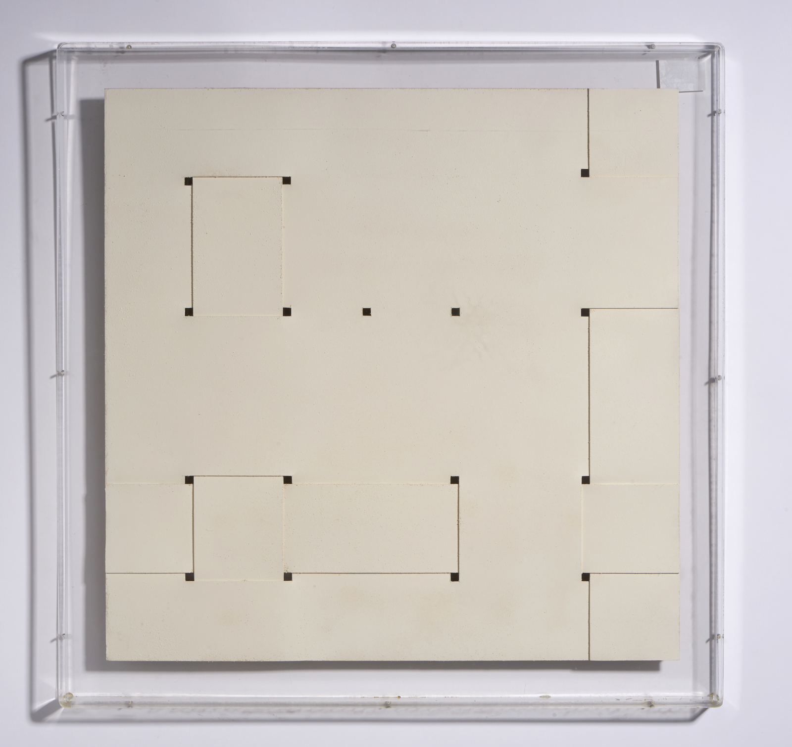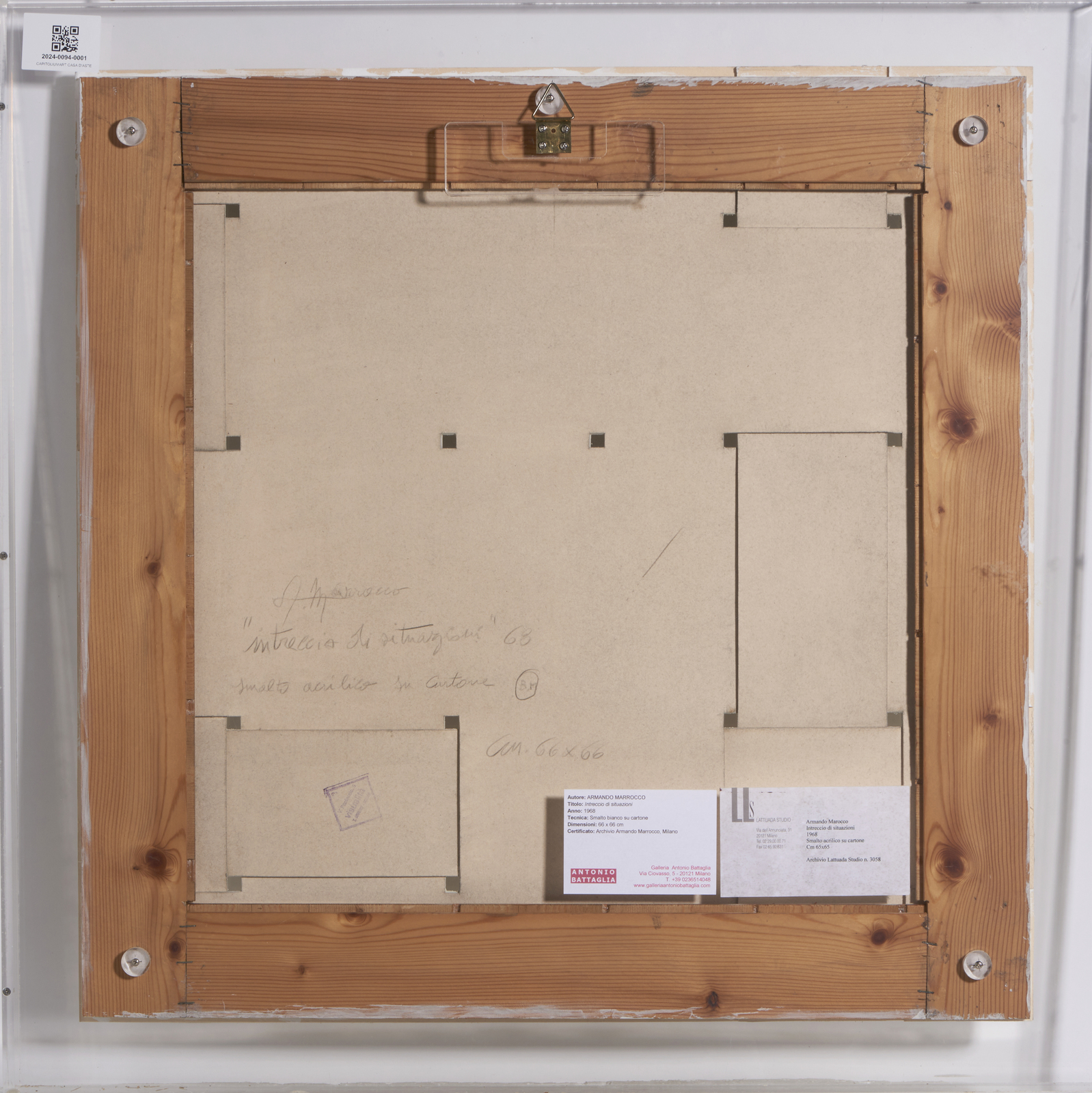 MARROCCO ARMANDO (n. 1939) INTRECCIO DI SITUAZIONI, 1968. smalto e acrilico su cartone entro teca di plexiglass. Cm 63,50 x 64,00. sull retro: firma, data e titolo; etichette Galleria Antonio Battaglia, Milano e Archivio Lattuada Studio, Milano