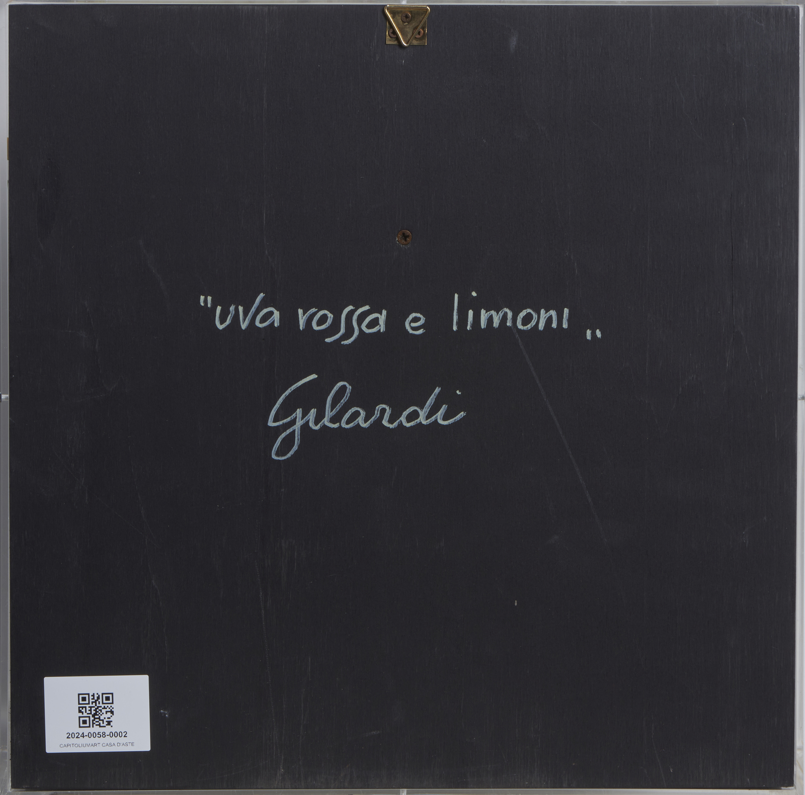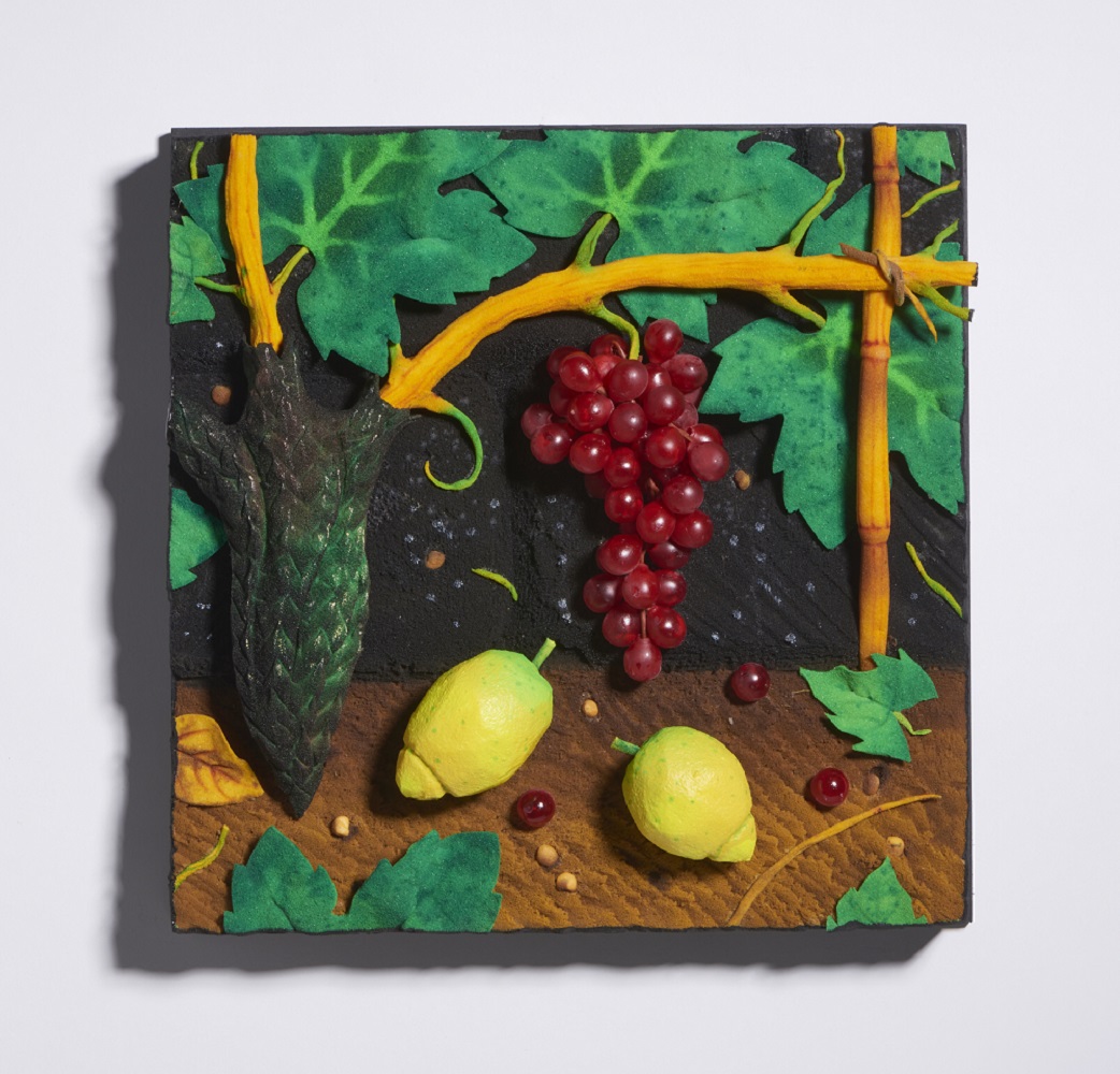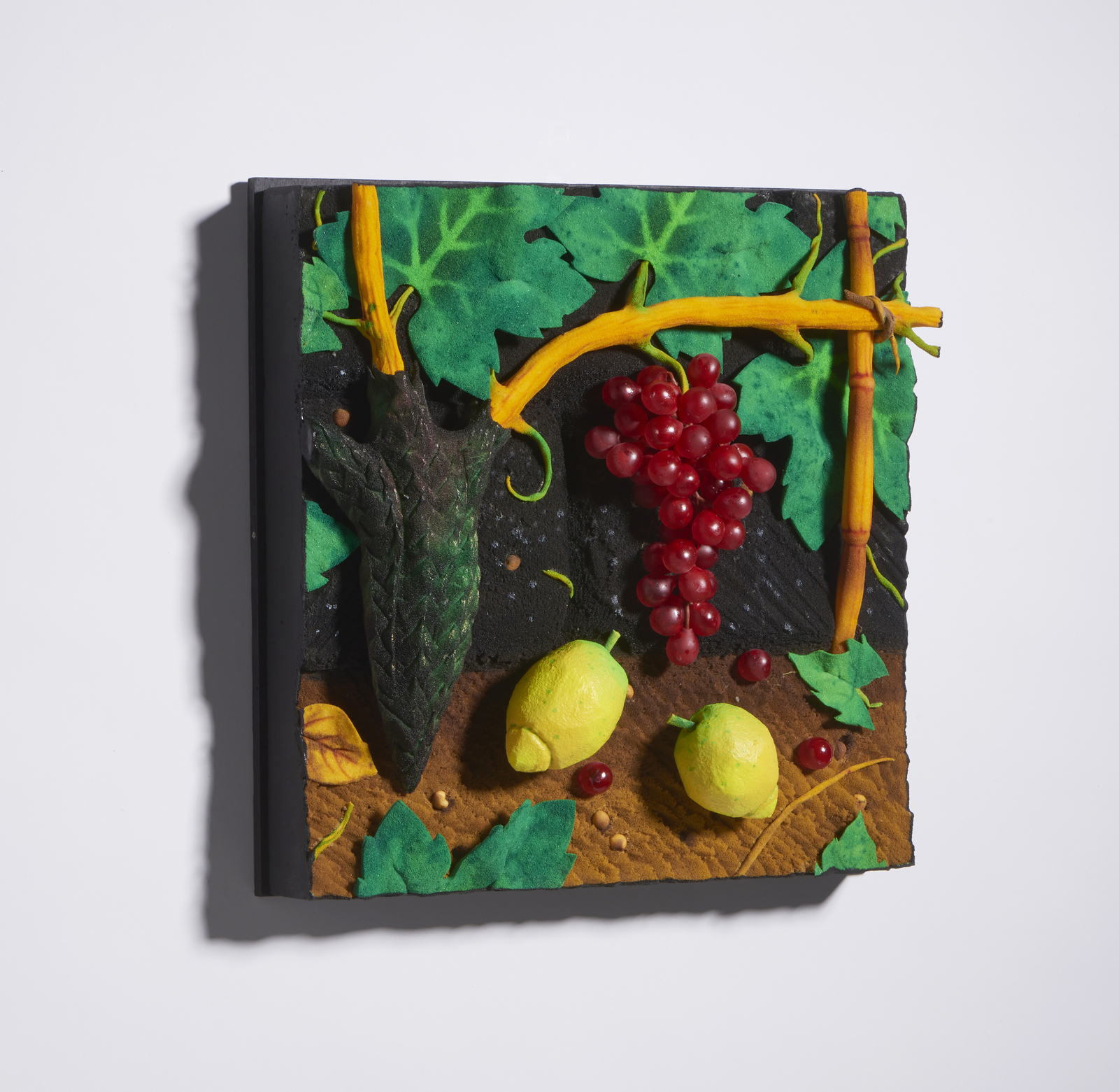 GILARDI PIERO (1942 - 2023) UVA ROSSA E LIMONI. poliuretano espanso dipinto, entro teca di plexiglass. Cm 39,00 x 39,00. sul retro: titolo e firma