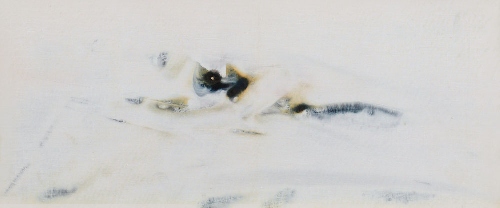 tecnica mista su tela colorata per combustione di fumogeni (da performance) applicata su tavola cm. 21x48, doppia firma e anno al retro, dichiarazione d'autenticità dell'artista su foto.