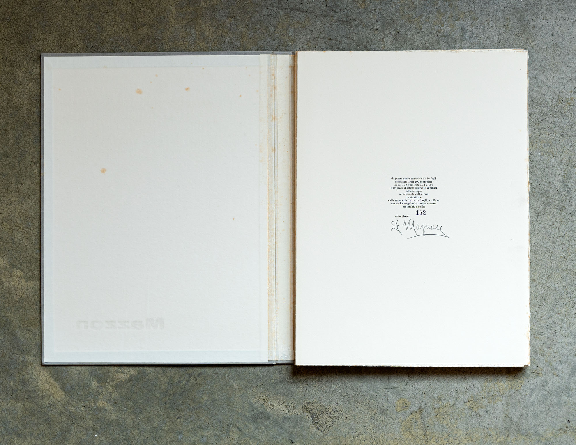 GALLIANO MAZZON(1896 - 1978)L'essenza dell'essere1972Cartella contenente dieci fogli, es. 152/190, firmato e numerato sul primo foglio39 x 29 x 3 cmEdizioni Il TrifoglioDifetti
