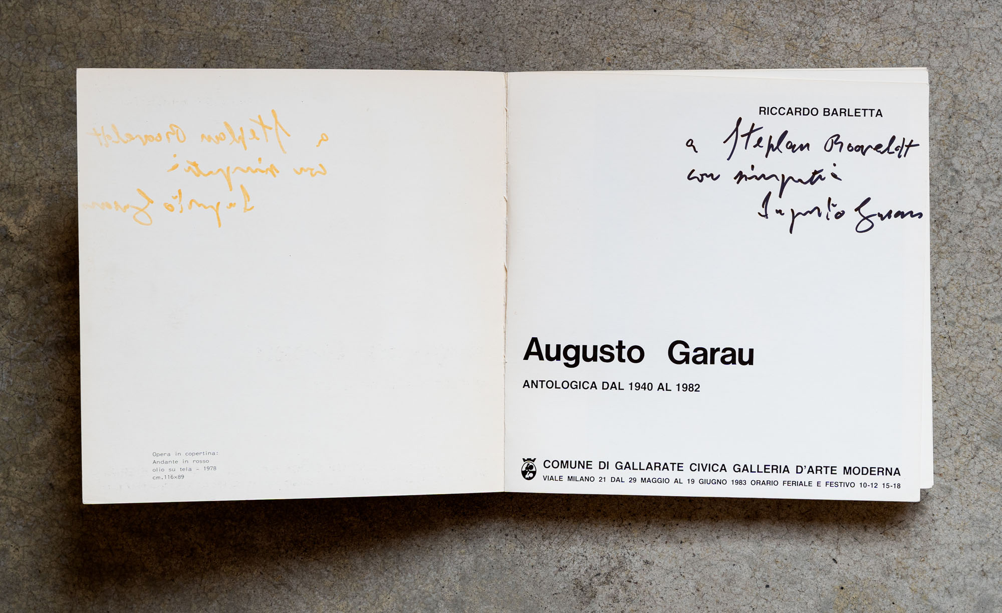 AUGUSTO GARAU(1923 - 2010)Antologica dal 1940 al 19821983Catalogo illustrato edito in occasione della mostra tenutasi presso la Civica Galleria d'Arte Moderna, Gallarate (29 maggio - 19 giugno 1983), firmato e dedicato sulla prima pagina21 x 21 cmEdizione del museoDifetti