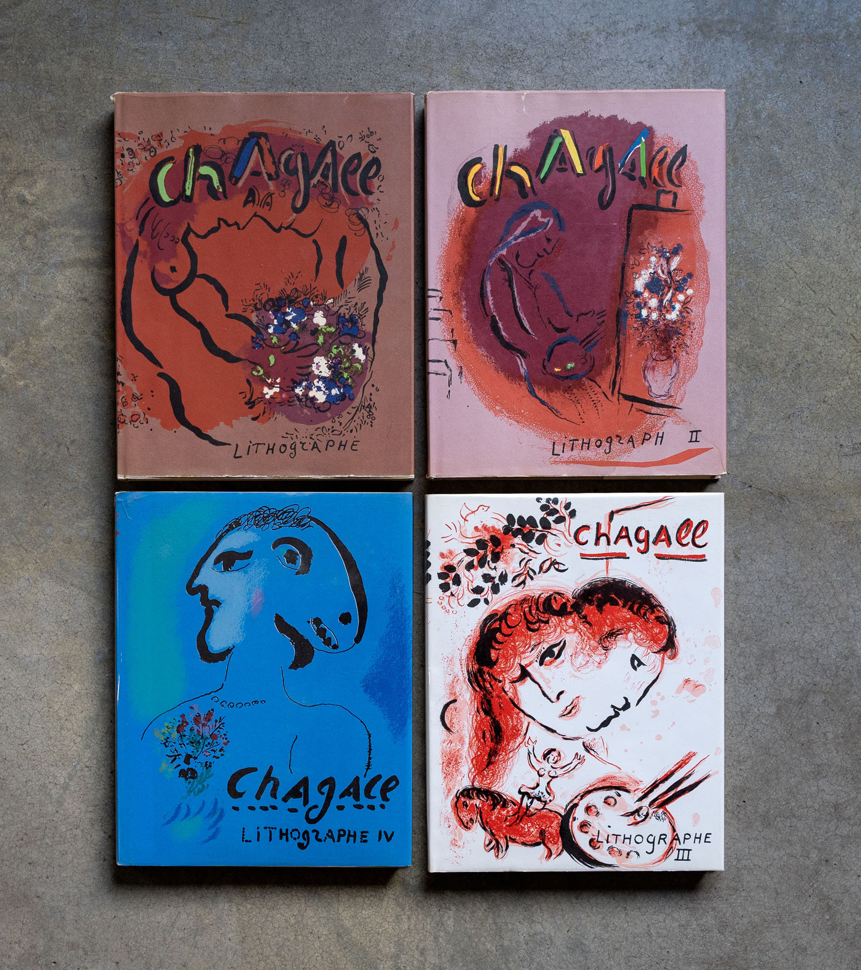 MARC CHAGALL(1887 - 1985)Chagall litographe I -IV1960 - 1974Primi quattro volumi del catalogo ragionato delle litografie, con varie litogafie inserite32,5 x 25 cmEdizione Andrè SauretDifetti