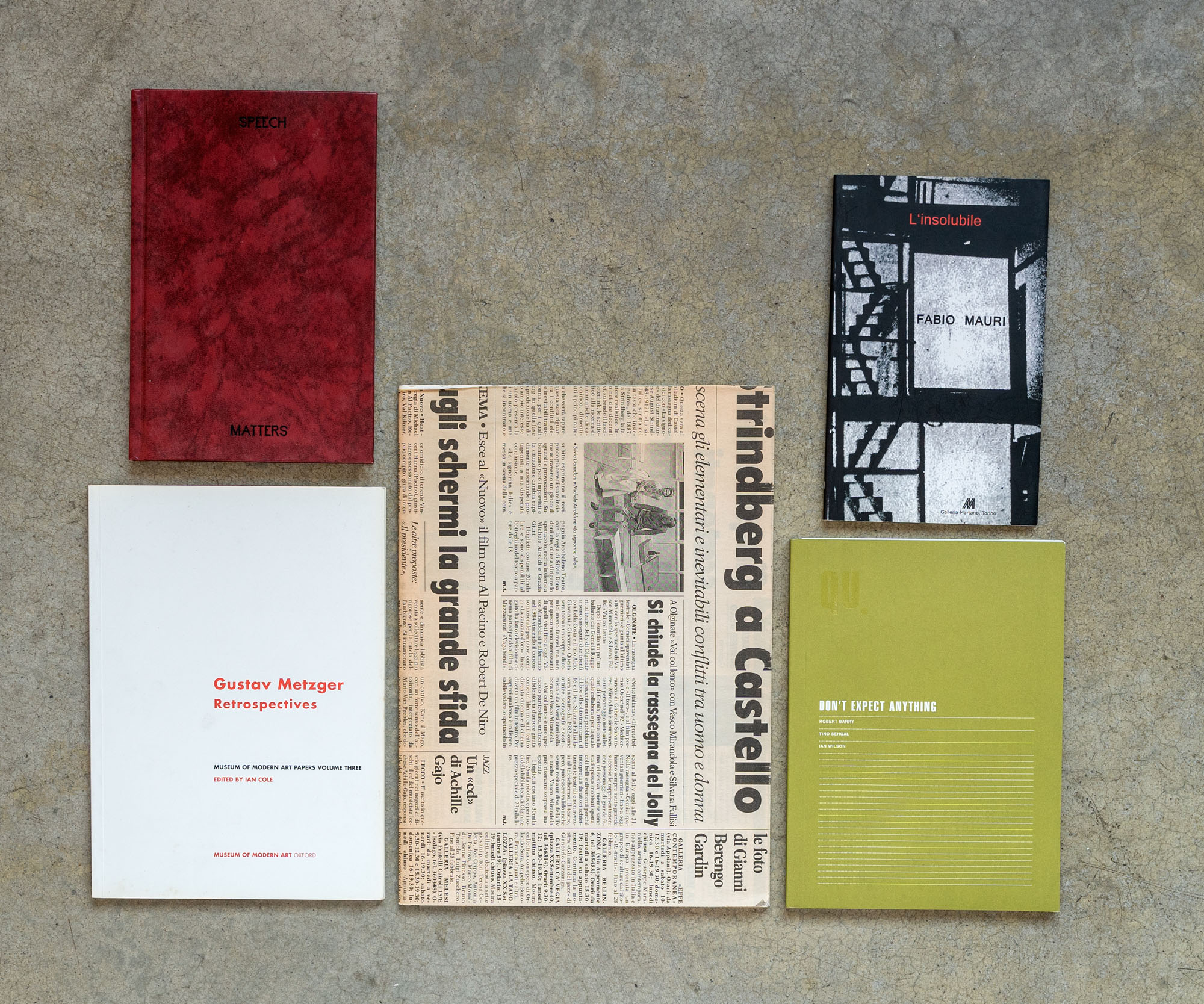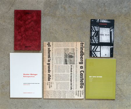 LOTTO MULTIPLOLotto di cinque cataloghiRobert Barry, Tino Sehgal, Ian Wilson - Don't expect anything 2004Catalogo illustrato edito in occasione della mostra tenutasi presso la galleria Massimo Minini, Brescia (11 marzo - 17 aprile 2004)21 x 15,5 cmEdizione della galleriaSenza difettiGustav Metzger - Retrospectives (volume 3)1999Catalogo illustrato23,5 x 16 cmEdizione Museum of Modern Art OxfordDifettiSpeech Matters. The danish pavillion at the 54th Venice Biennale2011Catalogo illustrato21 x 14 cmEdizione Mousse Magazine & PublishgSenza difettiFabio Mauri - L'insolubile2008Catalogo illustrato 19,5 x 12 cmEdizione Galleria MartanoSenza difettiDmitry Prigov - PrigovCatalogo illustrato29,5 x 21 cmEdizione Effe Arte ContemporaneaSenza difetti