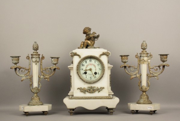 Trittico composto da un orologio e due candelabri in marmo bianco con finiture in bronzo dorato. Inizi XX secolo.