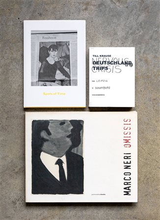 LOTTO MULTIPLOLotto di tre cataloghiMarco Neri - Omissis2006Catalogo illustrato edito in occasione della mostra tenutasi presso il Centro per l'Arte Contemporanea Luigi Pecci, Prato (6 maggio - 30 luglio 2006)24,5 x 30,5 cmEdizione Postmedia BooksDifettiTill Krause - Deutschland trips2011Libro d'artista16 x 12 cmSenza difettiRob Johannesma - Spots of time2012Catalogo illustrato24 x 17 cmEdizione Roma Publication 175Senza difetti