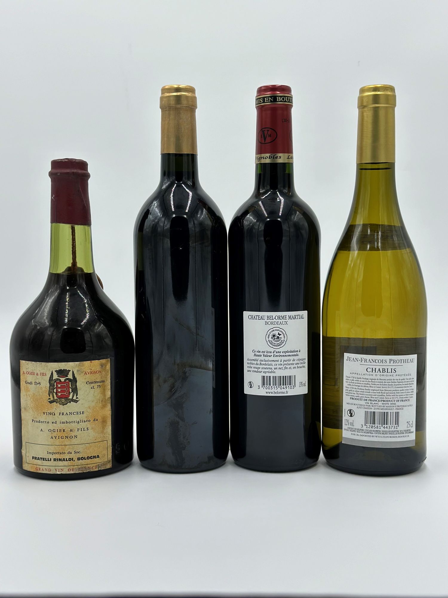 Francia-Varie 0,75 a) Francia, Cotes du Rhone - 1 bottiglia (bt), annata 1967. Livello: collo inferiore (BN). Condition report: etichetta e capsula in buone condizioni. b) Francia, Château Rauzan Seglà - 1 bottiglia (bt), annata 2001. Livello: entro il collo (WN). Condition report: etichetta e capsula in ottime condizioni. c) Francia, Chateau Bel-Orme Martial - 1 bottiglia (bt), annata 2019. Livello: entro il collo (WN). Condition report: etichetta e capsula in perfette condizioni. d) Francia, Chablis - 1 bottiglia (bt), annata 2021. Livello: entro il collo (WN). Condition report: etichetta e capsula in perfette condizioni.