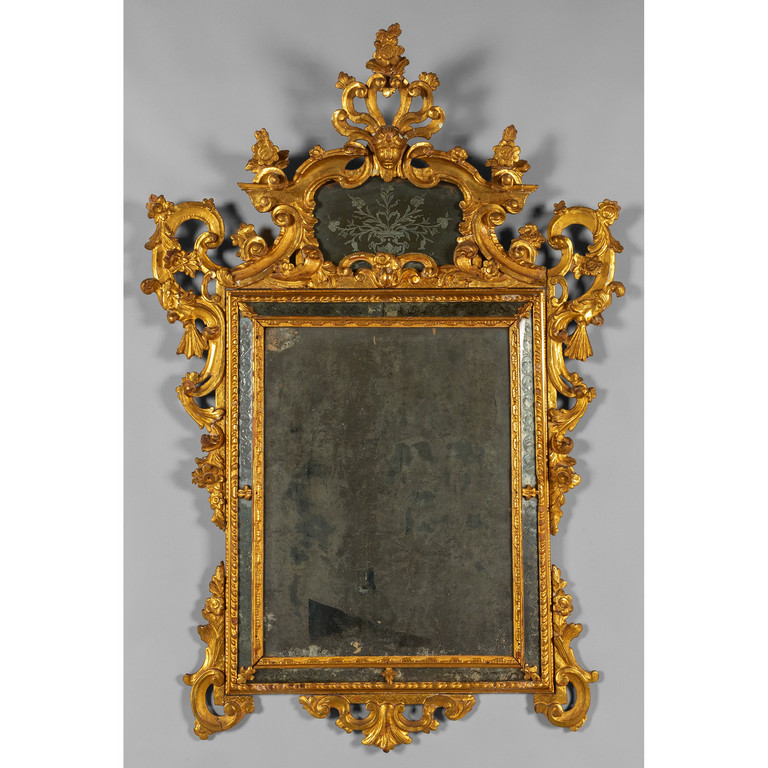 Specchiera Luigi XIV in legno intagliato e dorato con controspecchi e specchio superiore incisi Veneto metà sec.XVIII