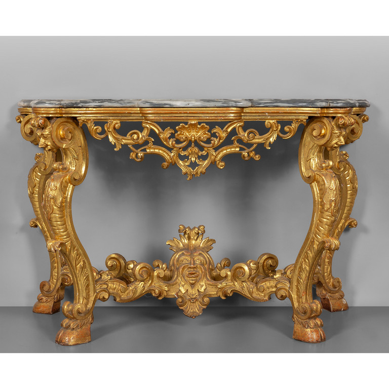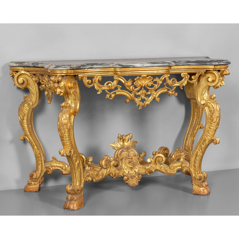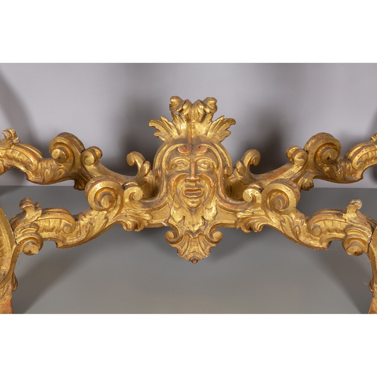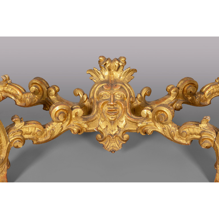 Console Luigi XIV in legno intagliato e dorato gambe raccordate da traversa con al centro mascherone piano in breccia antico Stati Pontifici metà sec.XVIII