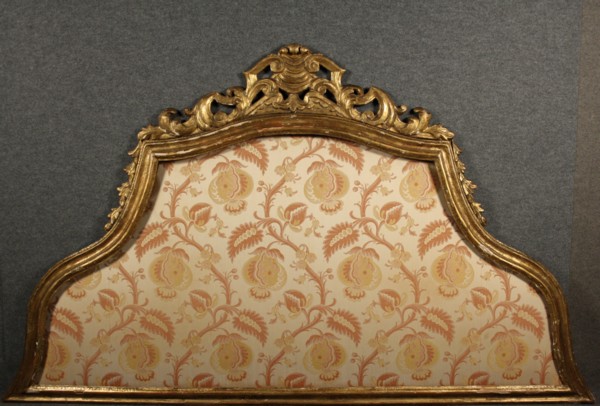 Testata da letto in legno intagliato e dorato con interno in tessuto imbottito. Fine XVIII secolo. Difetti. Mis. Lung. cm. 205 Alt. cm. 126 ca.