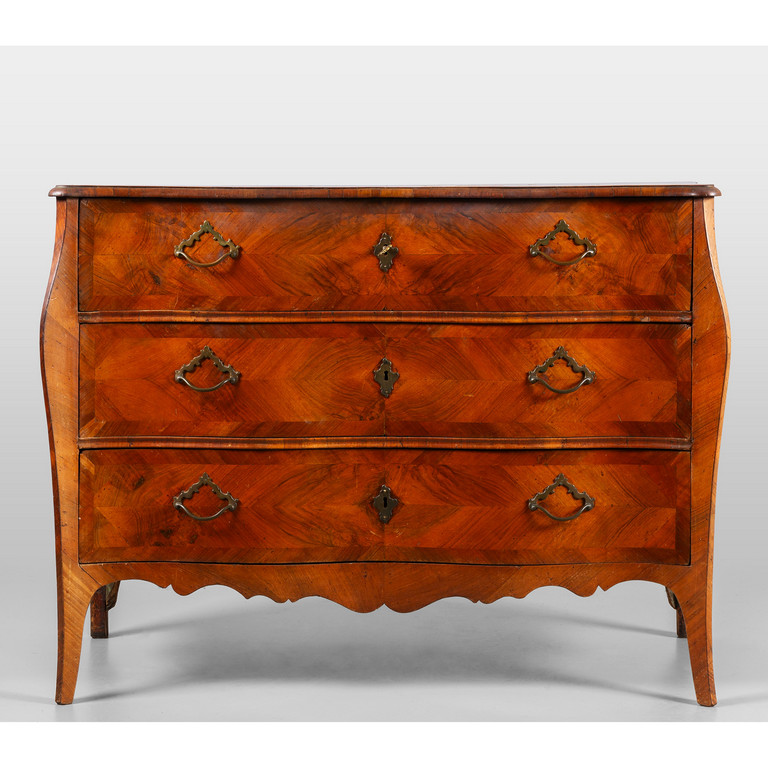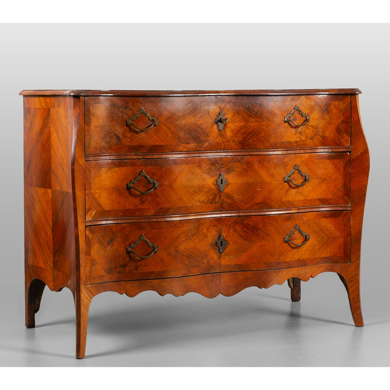 Comò Luigi XIV a tre cassetti doppia mossa sul fronte piano lastronato Genova metà sec.XVIII