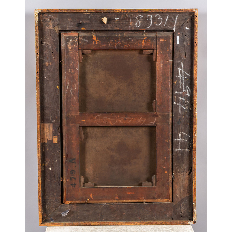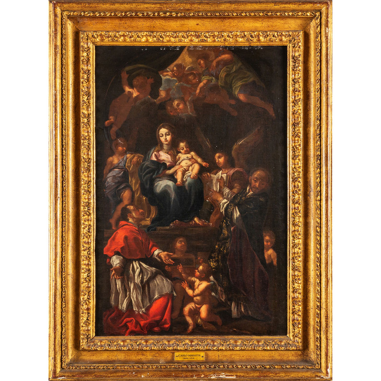 Scuola napoletana sec.XVII 'Adorazione della Vergine e del Bambino con Angeli' olio cornice in legno intagliato e dorato