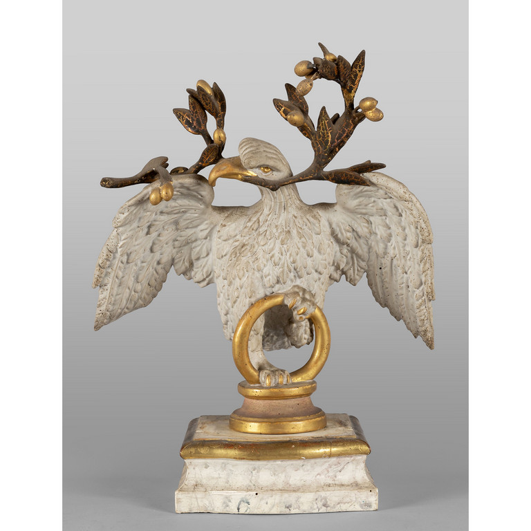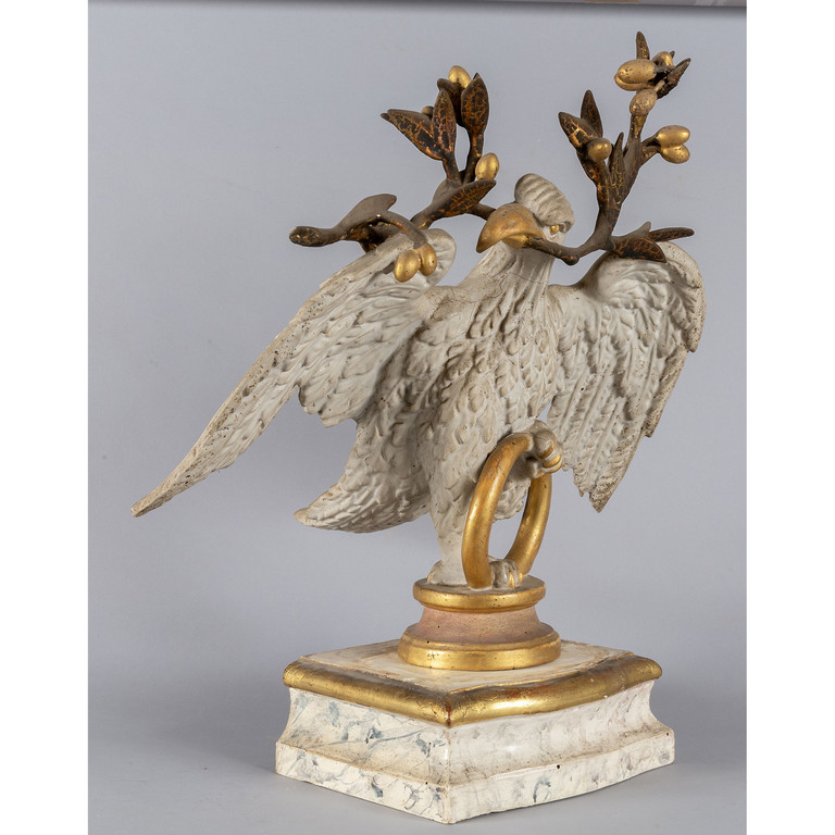 Aquila trionfante con ramo di ulivo scultura in legno inatgliato laccato e dorato fine sec.XVIII