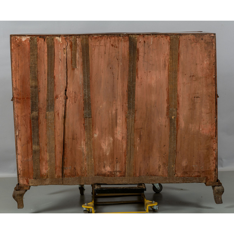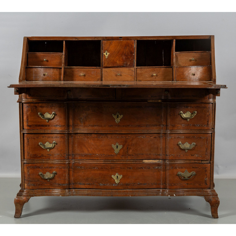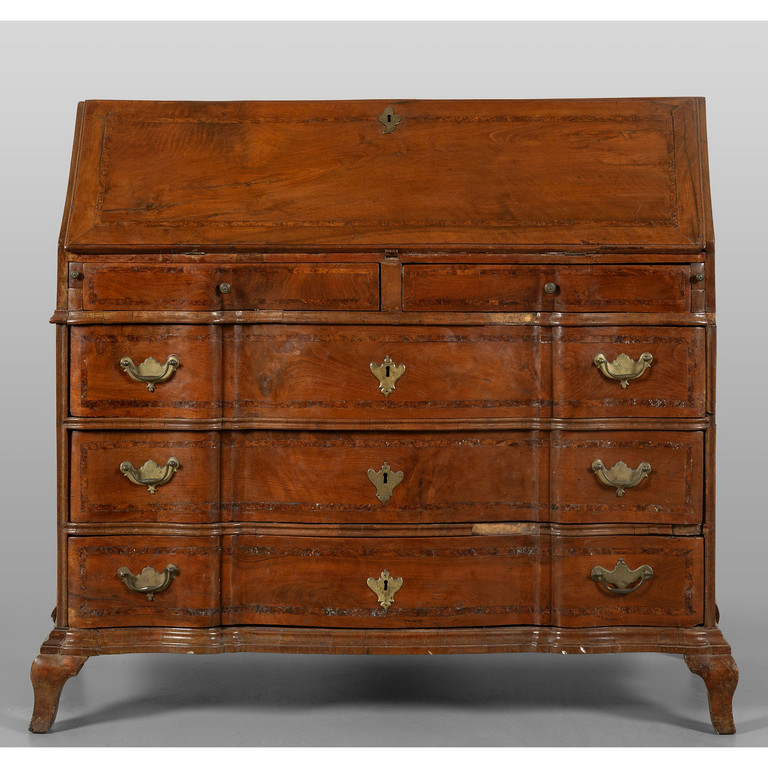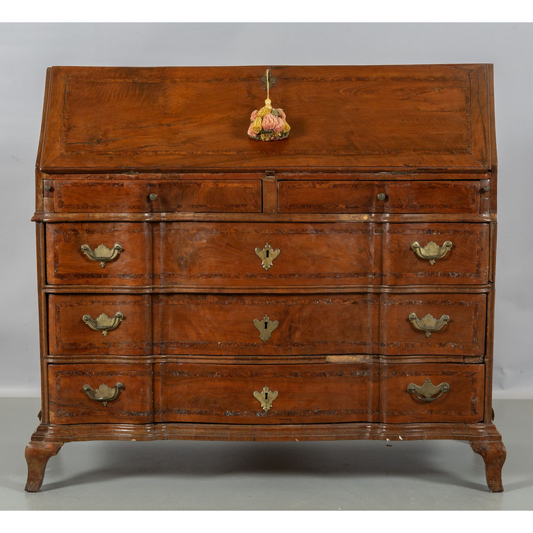 Ribalta Luigi XIV a tre cassetti più due in massello di noce filettata in radica Genova I metà sec.XVIII