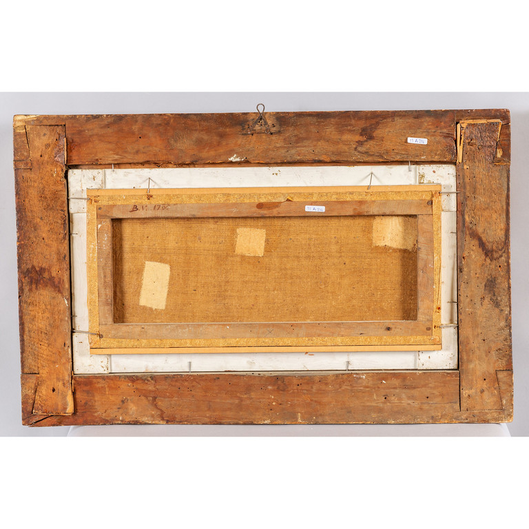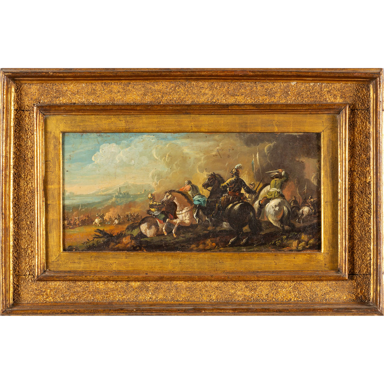 Scuola veneta sec.XVIII 'Battaglia tra cavalieri' olio cornice coeva in legno intagliato e dorato