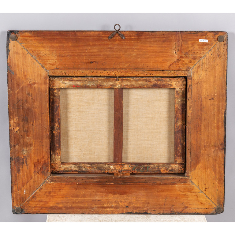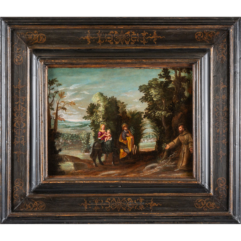 Scuola italiana sec.XVIII 'La fuga in Egitto' olio cornice antica in legno ebanizzato