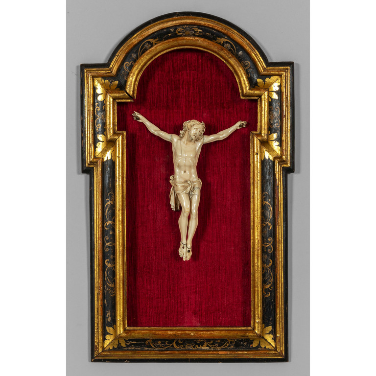 Cristo Crocefisso scultura in avorio finemente intagliato montato in cornice in legno intagliato e laccato Arte Spagnola sec.XVII