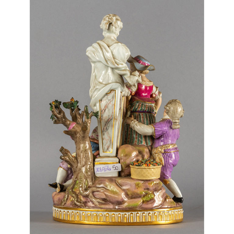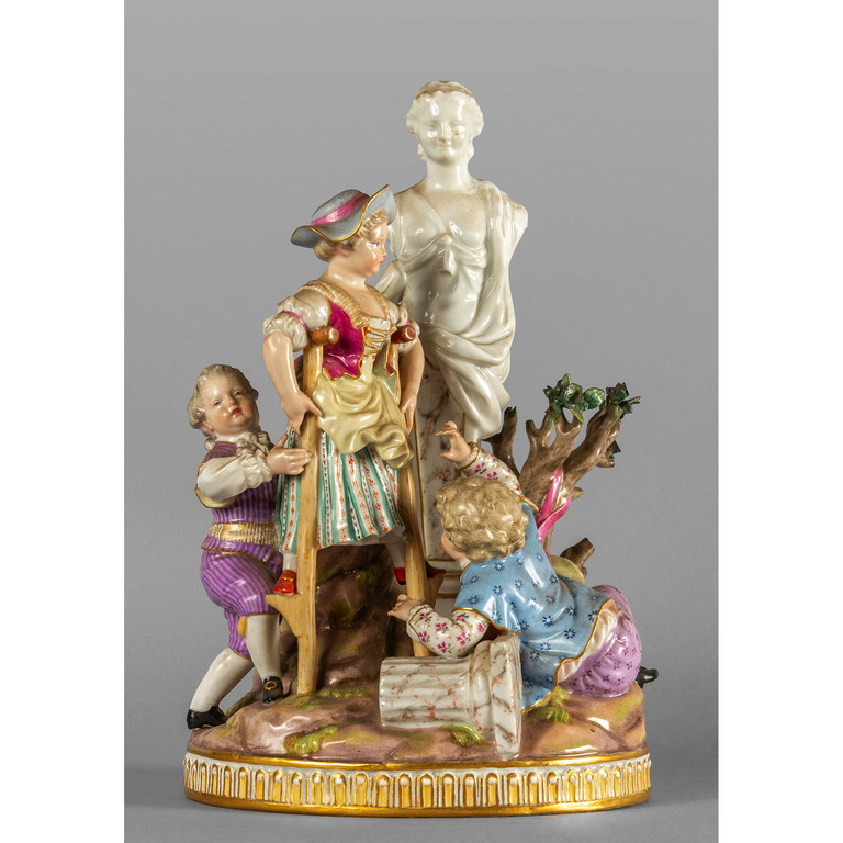 Gruppo in porcellana policroma raffigurante tre bambini intorno ad un'erma Meissen sec.XIX