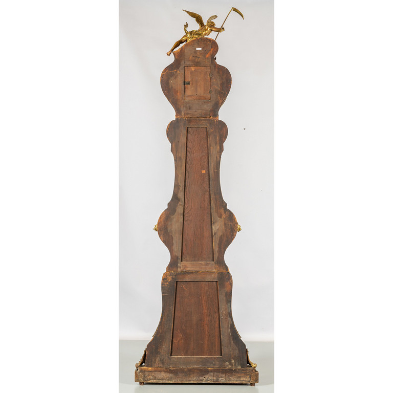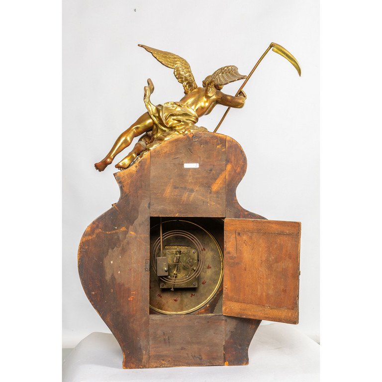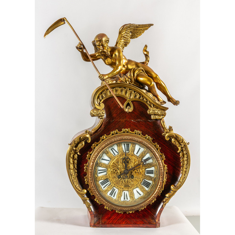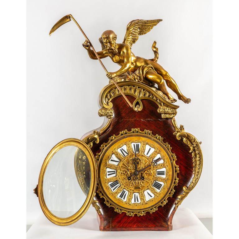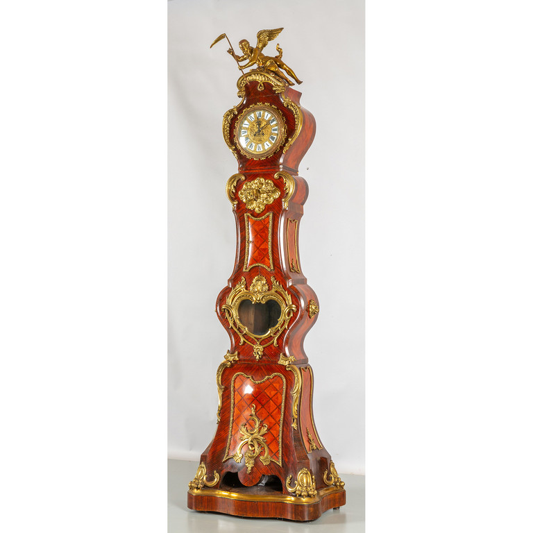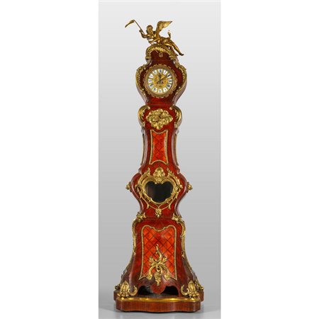 Importante orologio Napoleone III a torre lastronato in palissandro e bois de rose ricchissima decorazione in bronzo dorato parte superiore con statua in bronzo raffigurante l'allegoria del tempo Francia fine sec.XIX