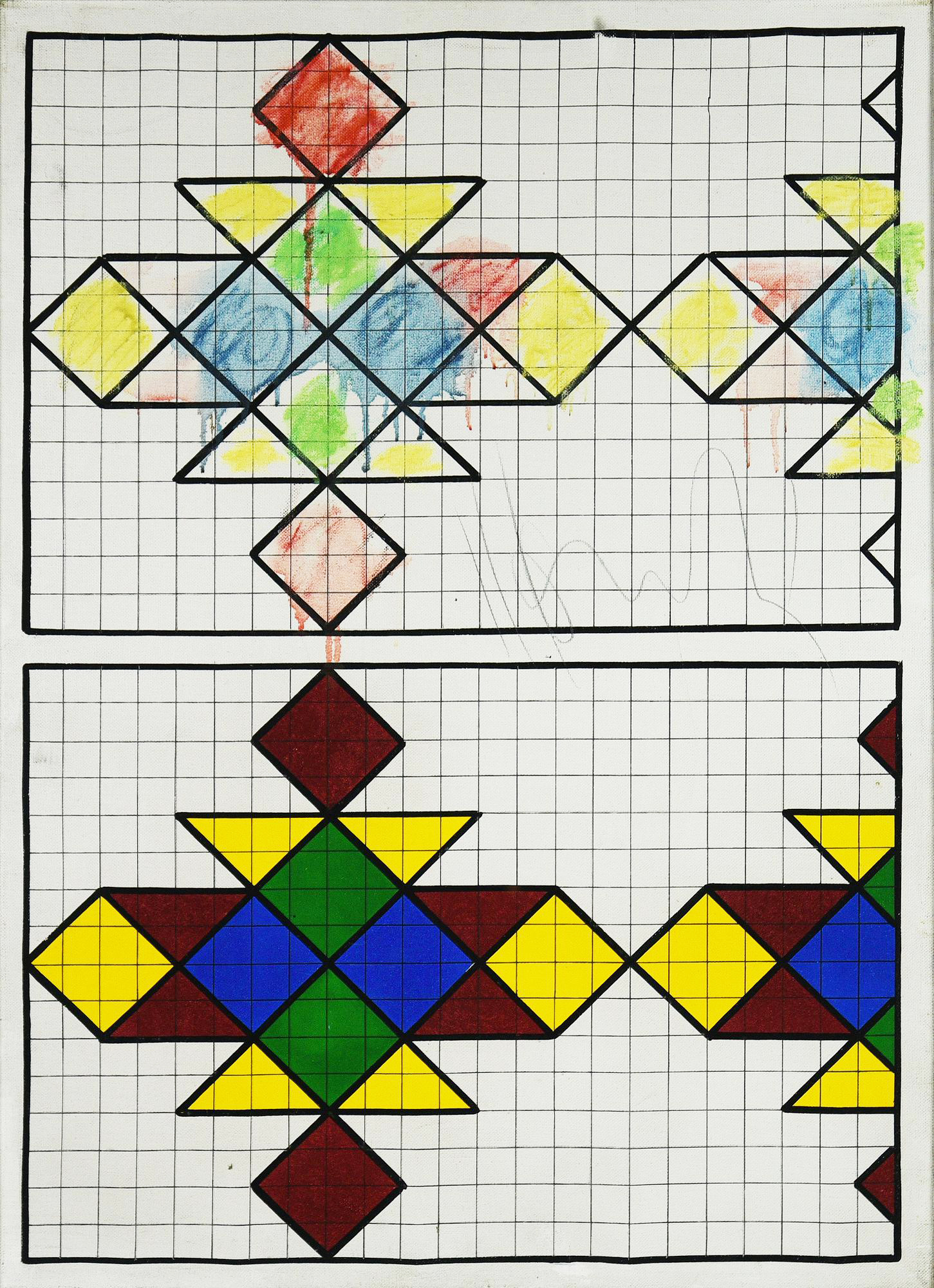 Aldo Mondino SENZA TITOLO, (1967-1969) tecnica mista su tela, cm 70x50 firma...