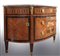 Commode a mezza luna con doppio cassetto centrale senza traversa e mezzo cassetto superiore. Due sportelli laterali. Piano superiore in marmo bianco di Carrara. In legno di amaranto, legno di rosa e legni di frutto. Decorazioni in bronzo dorato.