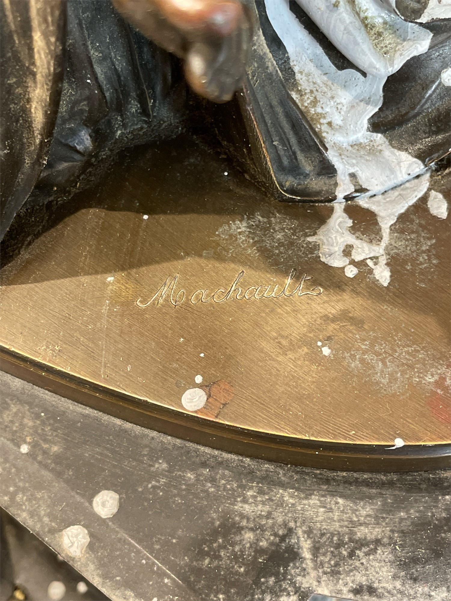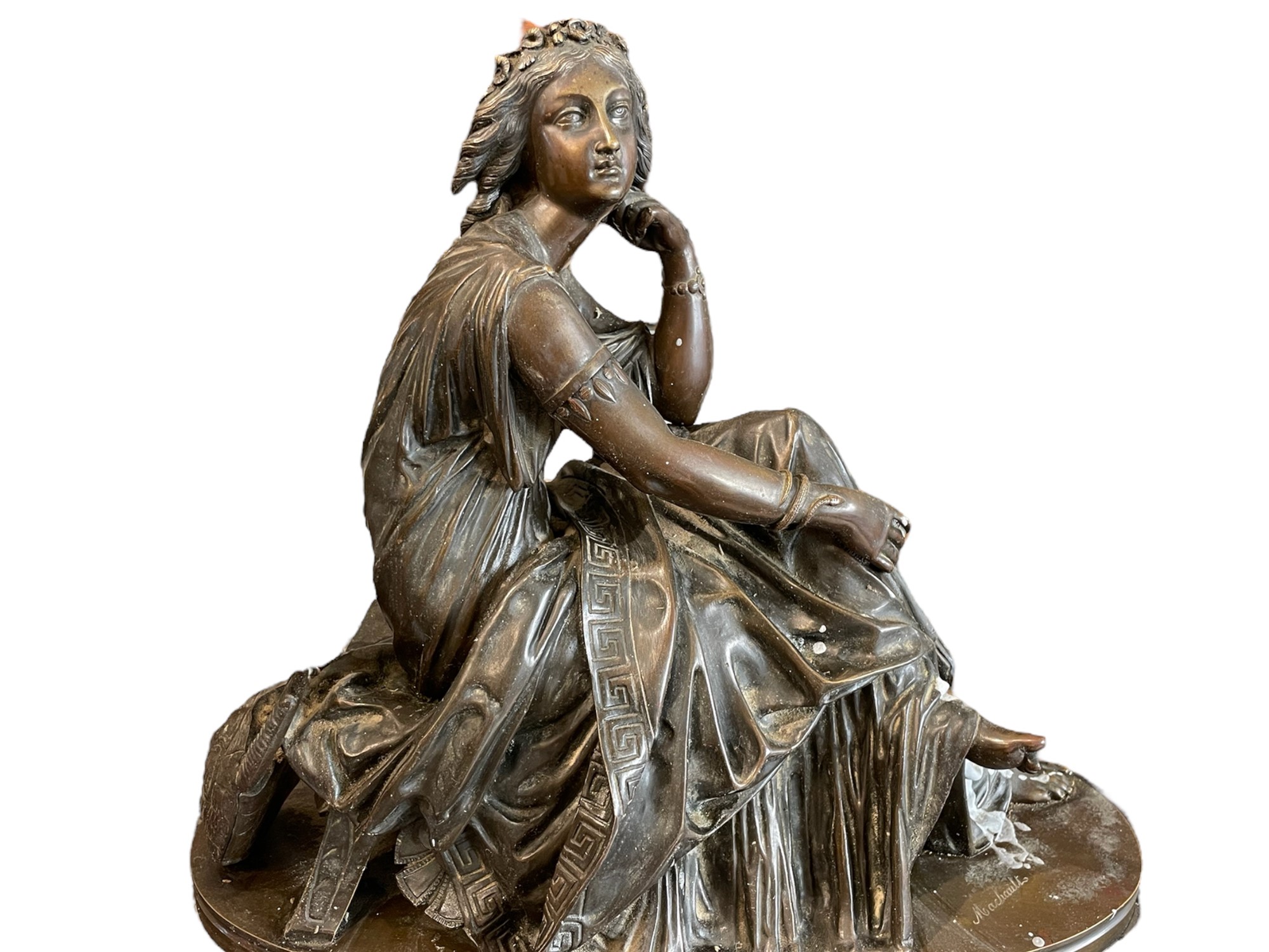 raffigurante Calliope, poggiante su basamento in marmo nero. Meccanica firmata Japy et Freres. Scultura recante firma Machault. Restauri e mancanze