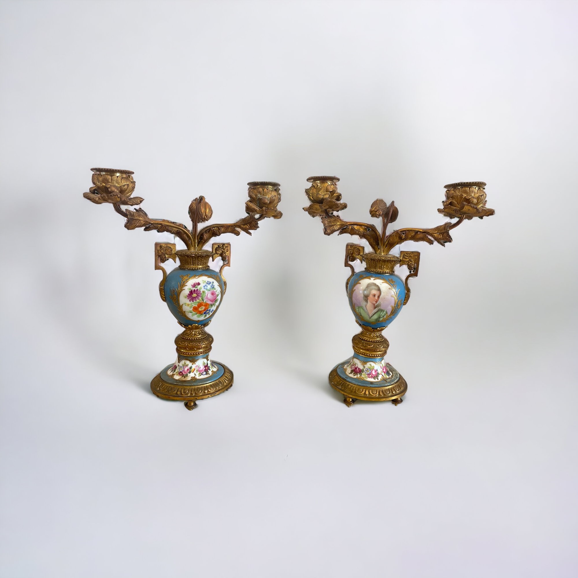 A due bracci, corpo centrale e basamento in porcellana di Sevres e bronzo dorato. Manifattura francese. Restauri.