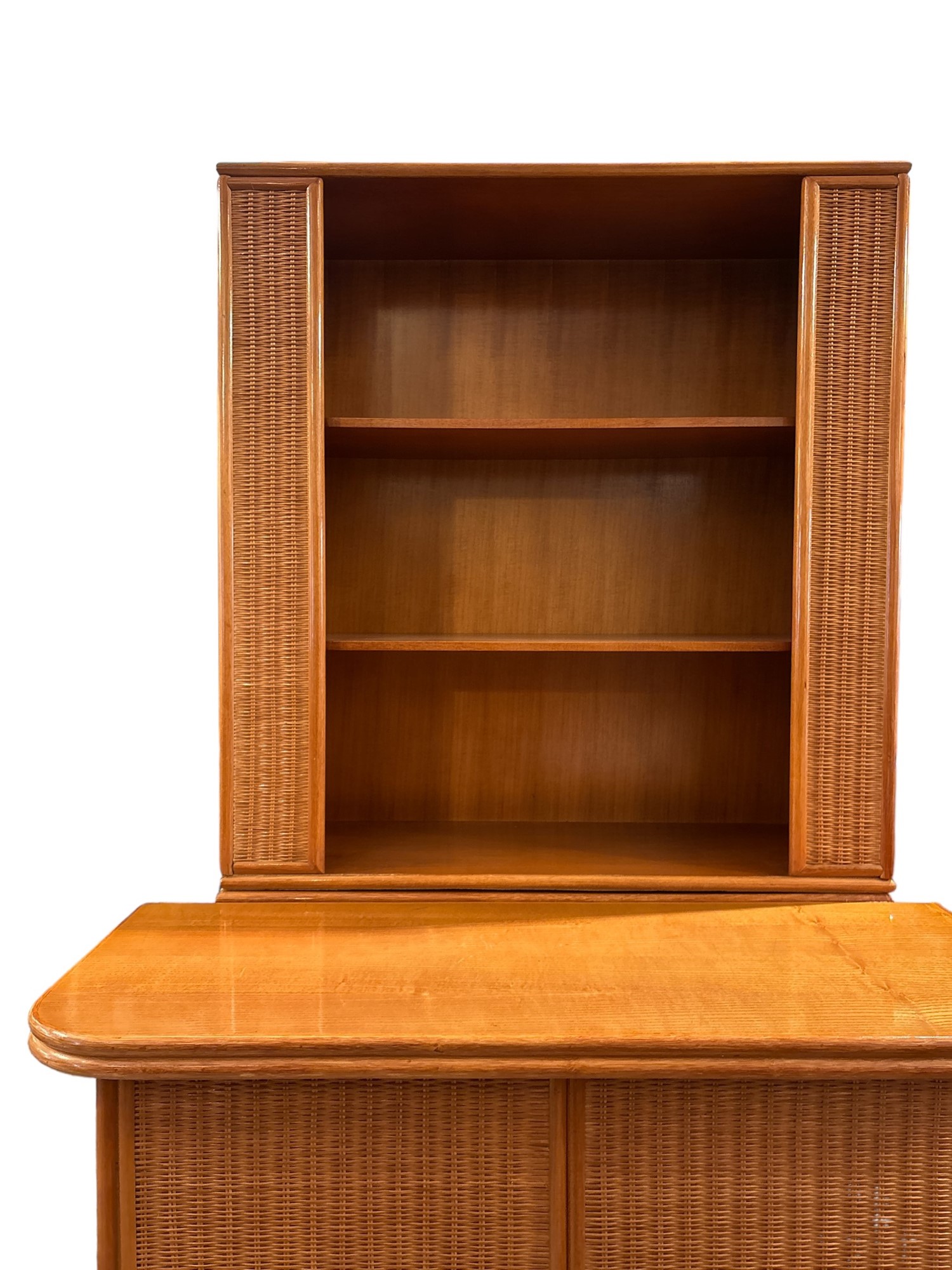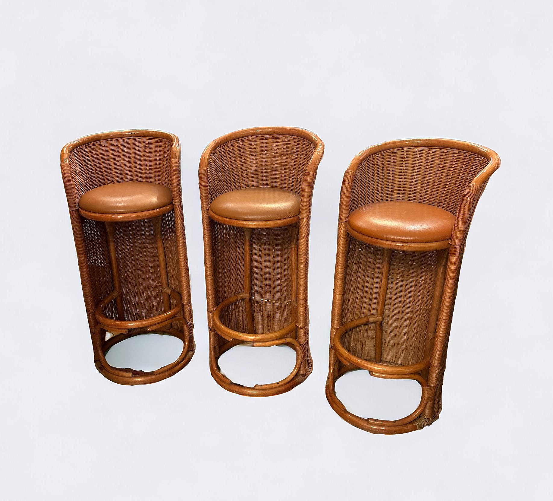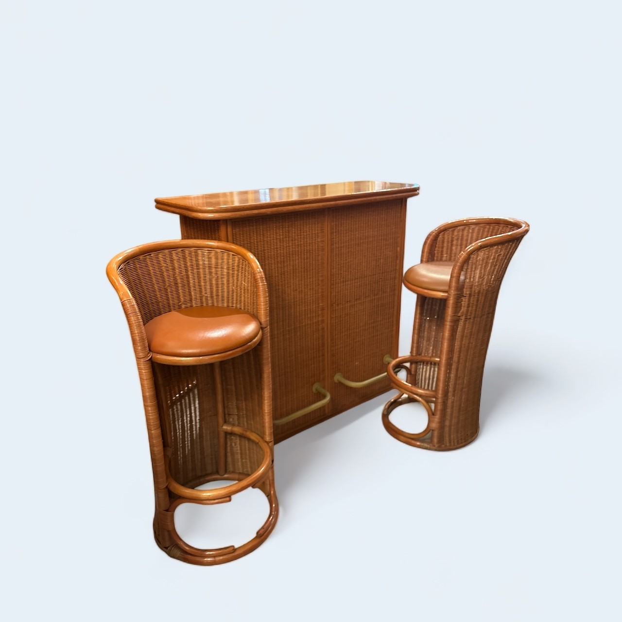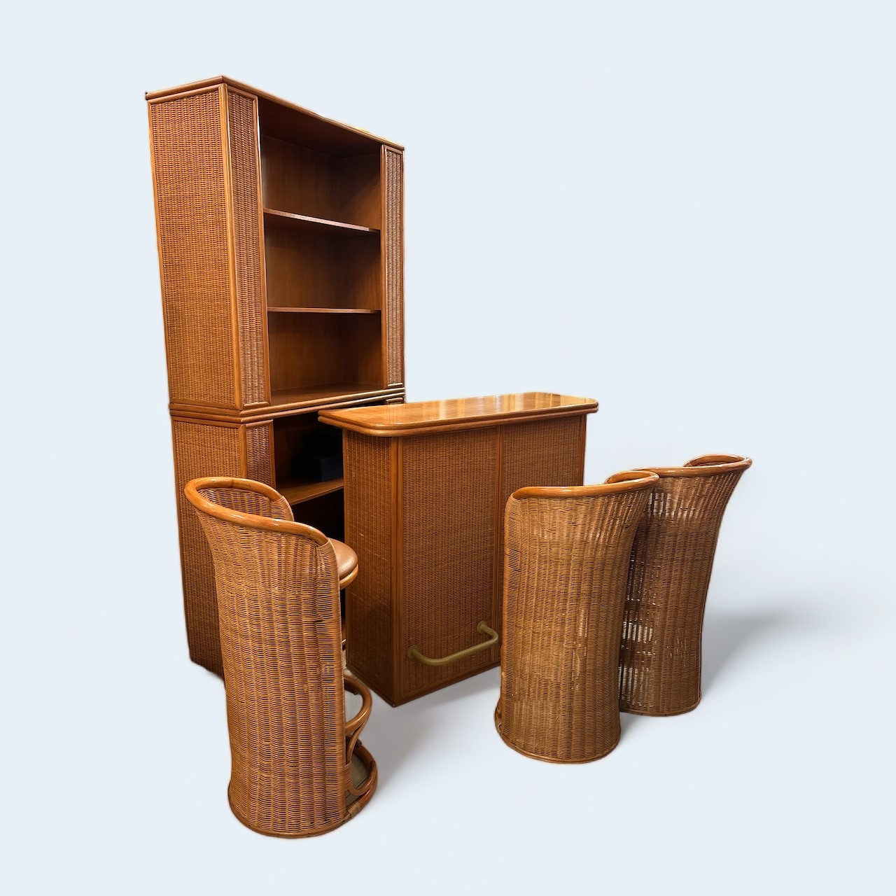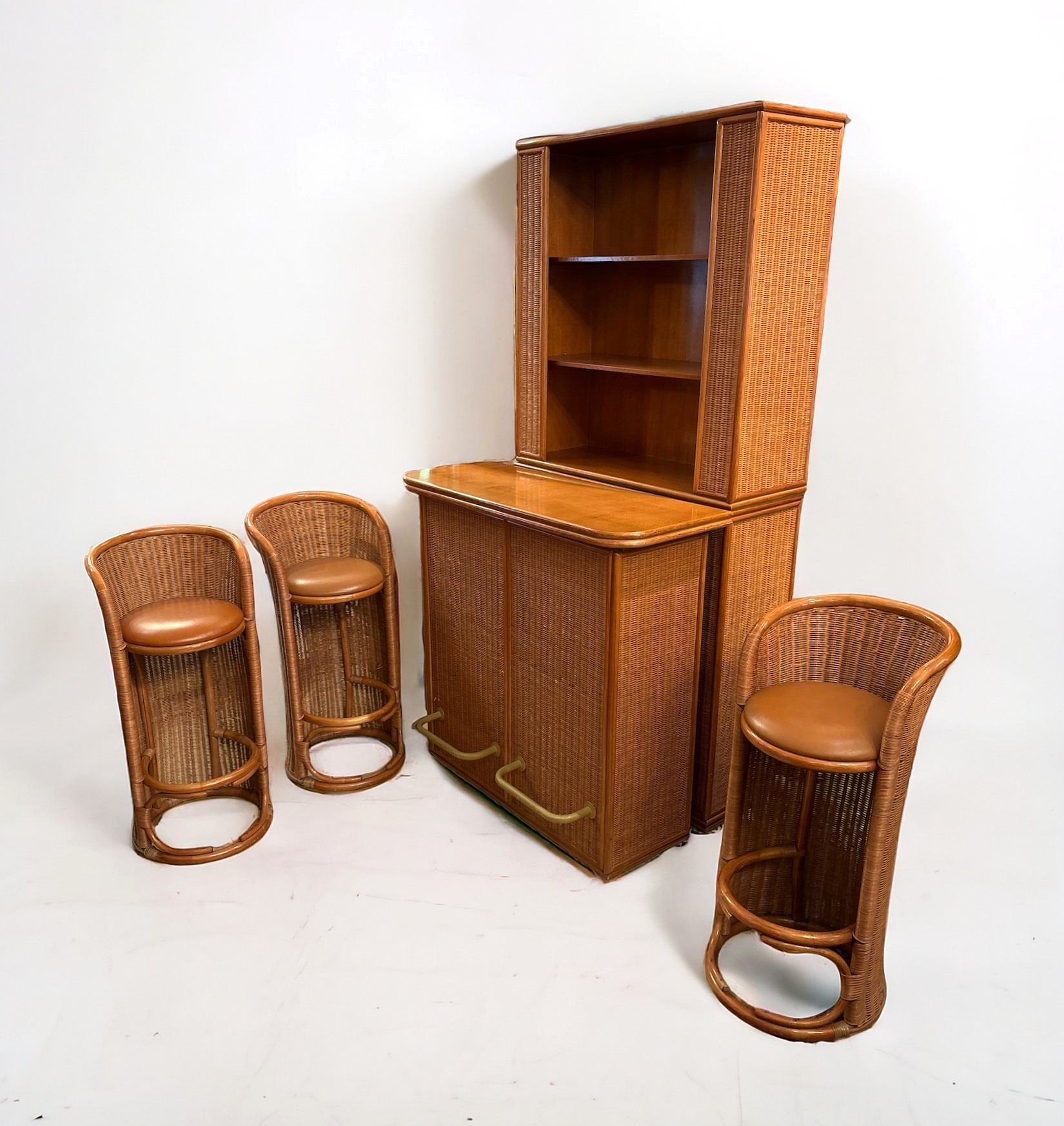 in midollino, composto da 3 sgabelli, un mobile bancone bar con poggia piedi in metallo cromato, e étagère a due corpi a vista.