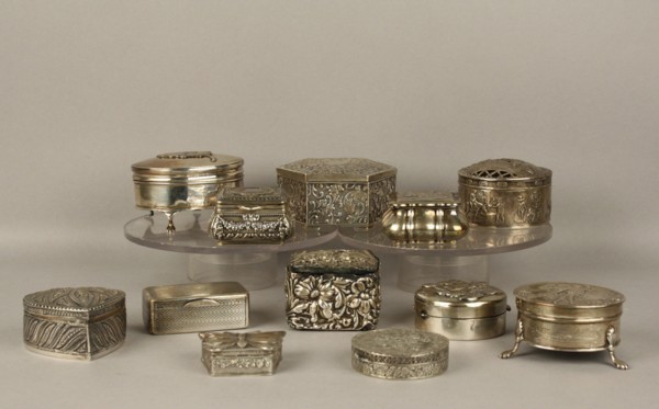 Lotto 271 | Dodici scatolette in argento sbalzato e cesellato di varie forme, gr. 500 ca....