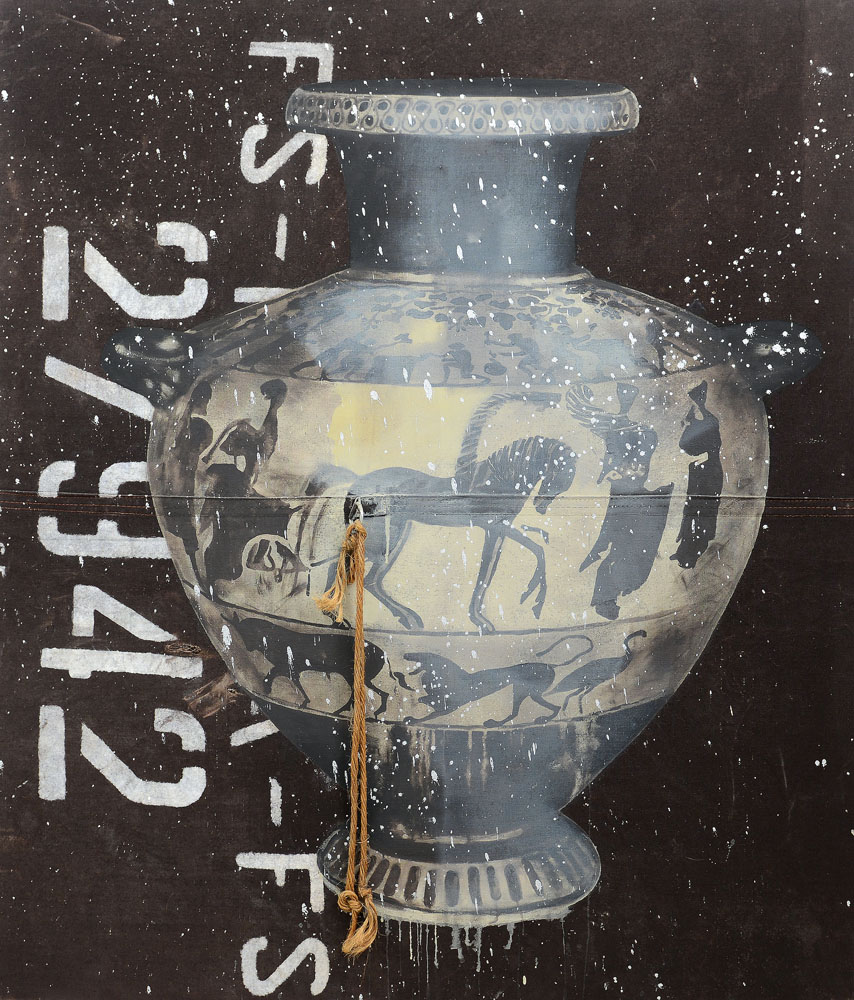 acrilici, polvere d'alluminio e corda su telone di copertura di vagone ferroviario cm. 171x146x3,5; firma, titolo, anno e località (Milano) al retro, dichiarazione d'autenticità dell'artista su foto, opera priva di cornice.