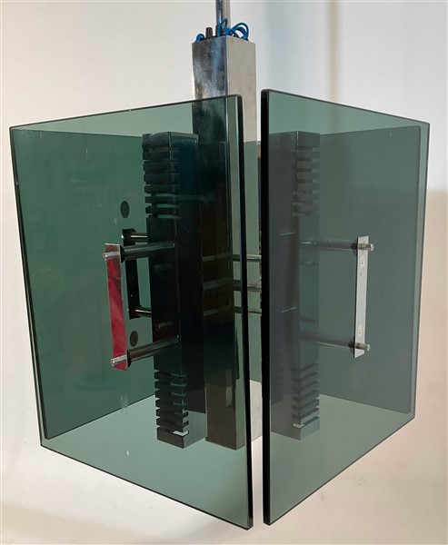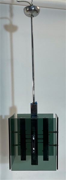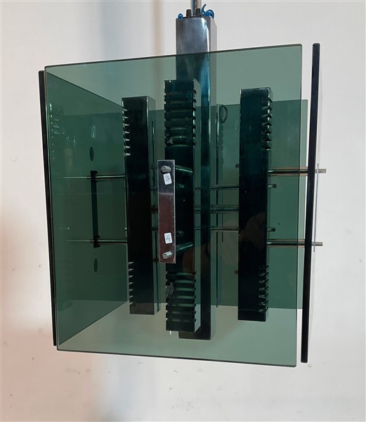 Lampadario a otto luci. Italia, anni '70. Struttura in metallo cromato e diffusori in vetro fumé. (h cm 115)