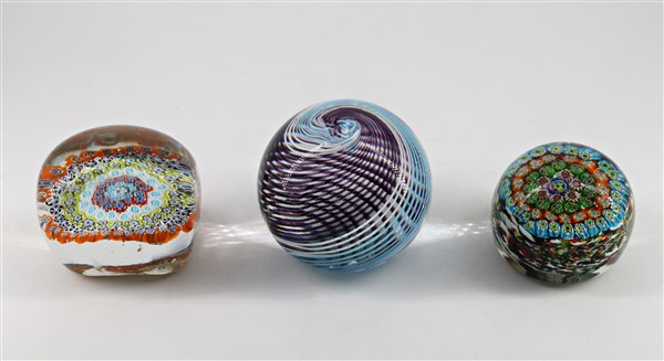 Lotto composto da tre presse papier in vetro di diverso decoro. (lievi difetti)