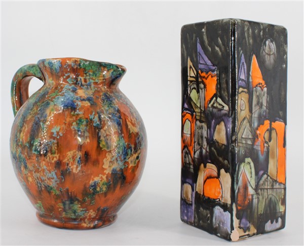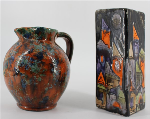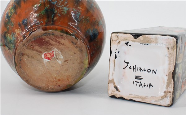 Due ceramiche decorative smaltate in policromia, di cui una di forma parallelepipeda decorata con paesaggio urbano fimata Schiavon. Italia, anni '60/'70. (h max cm 23) (difetti)