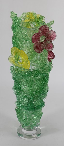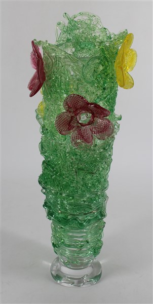 Vaso in cristallo trasparente incolore con applicazioni a caldo di fili e fiori aggettanti in vetro trasparente verde, giallo e ametista. Seconda metà secolo XX. (h cm 49) (difetti e piccole mancanze)