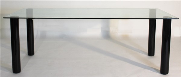 Tavolo modello "Brentano". Nova Milanese, 1982. Piano in cristallo con bordi bisellati. Gambe smontabili in acciaio verniciato nero. (cm 199x73x89) (lievi difetti)