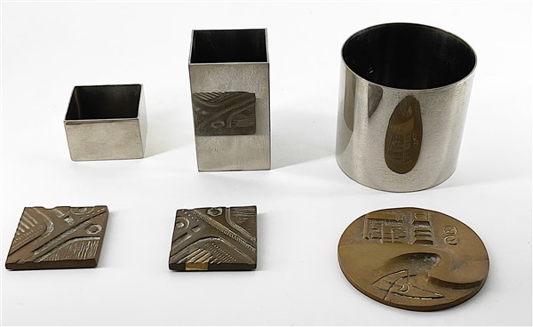 Gruppo di tre scatole in acciaio con coperchi in bronzo a decoro astratto. Ital