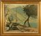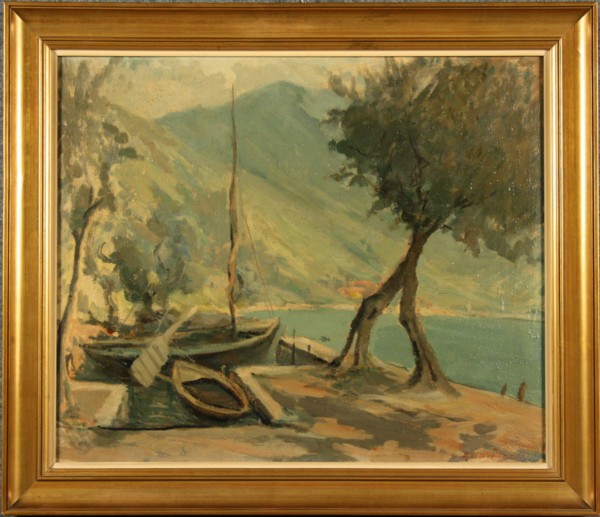 Dipinto olio su tela raff. ''PAESAGGIO LACUSTRE CON BARCA''. Firmato B....