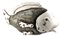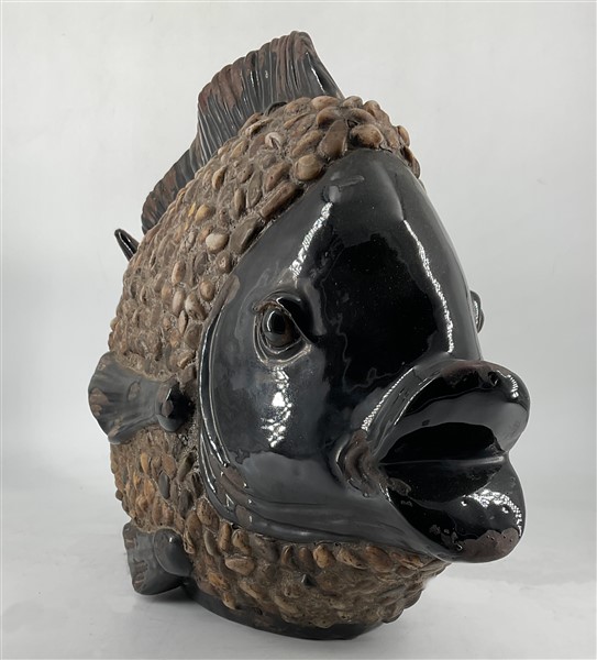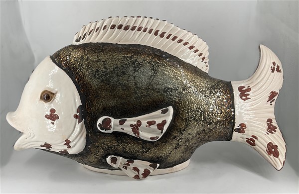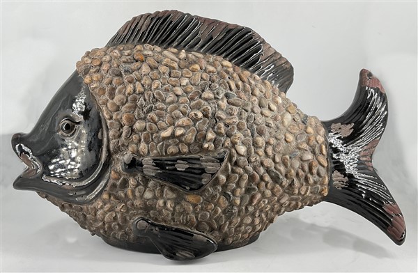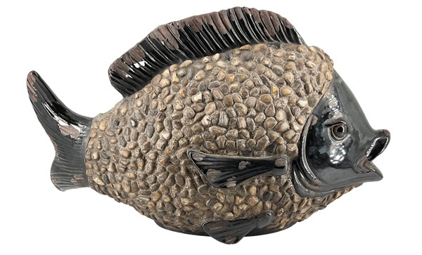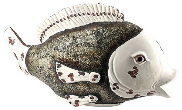Lotto di due pesci in ceramica rispettivamente smaltati in bianco e in marrone e con applicazione di scaglie di vetro e ciottoli di fiume. Italia, seconda metà secolo XX. (l cm 70) (difetti)