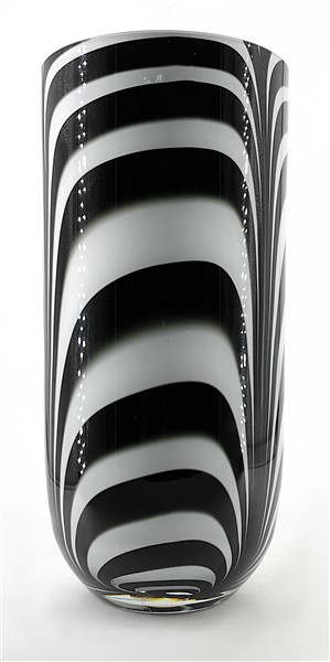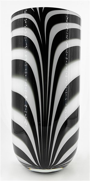 Vaso in vetro sommerso con decoro a fasce bianche e nere. Seconda metà secolo XX. (h cm 42)