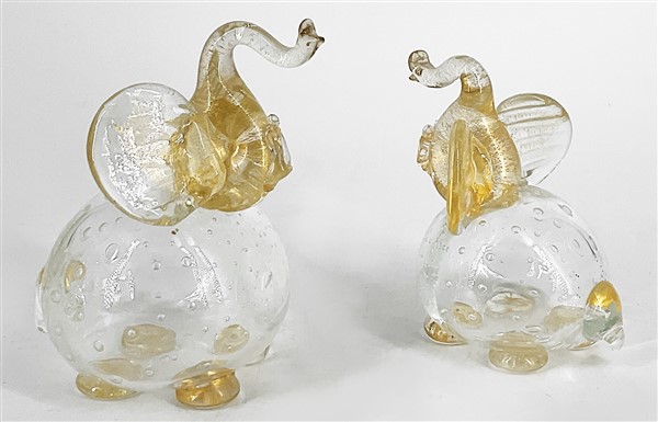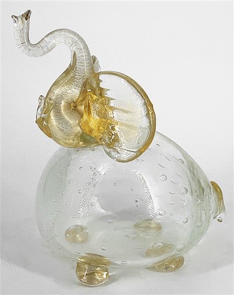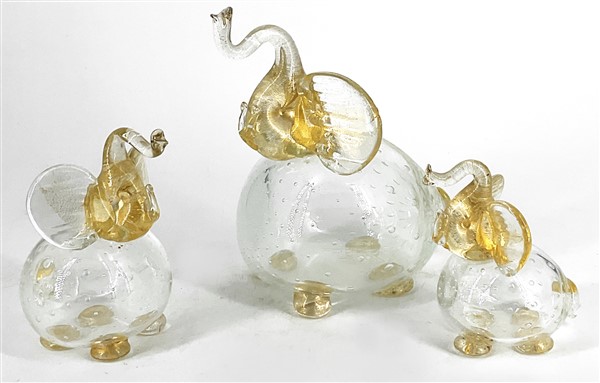 Lotto composto da tre elefanti in vetro soffiato incolore con applicazione di foglia d'oro e inclusione di bolle. Seconda metà secolo XX. (h max cm 21)