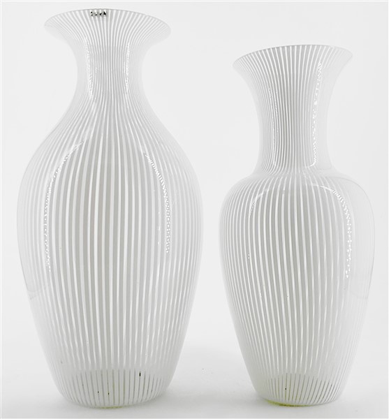 Lotto di due vasi a balaustro in vetro soffiato a canne lattimo e incolore. Venezia, anni '70/'80. Firmati a punta sotto la base e recanti etichetta della manifattura. (h max cm 36; d cm 36) (difetti)