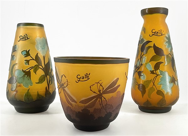 Manifattura europea Lotto di tre vasi a cammeo imitanti i modelli di Gallé. Seco