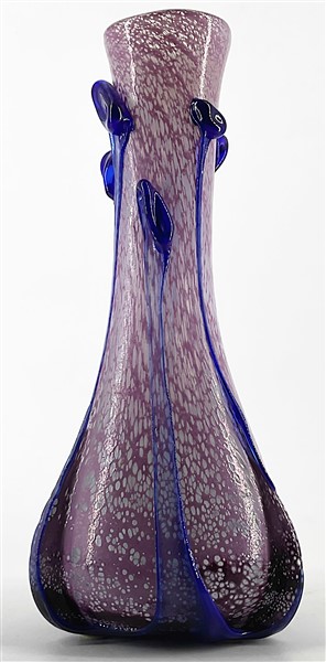 Vaso imitante lo stile Liberty in vetro soffiato incolore, lattimo, glicine e blu. Seconda metà secolo XX. (h cm 34)