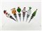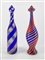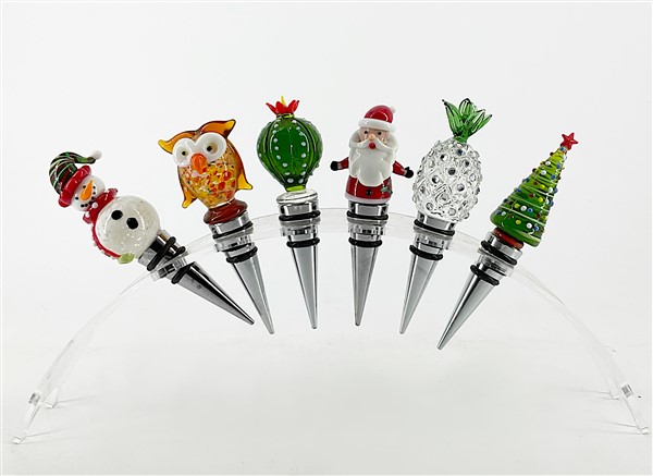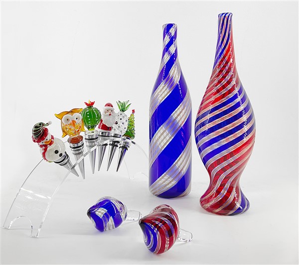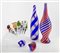 Lotto composto da due bottiglie con tappo in vetro soffiato a canne ritorte incolore, avventurina, rosso e blu trasparente; unite a un gruppo di sei tappi in metallo decorati con soggetti diversi in vetro soffiato e pasta vitrea policroma montati su base in plexiglass. Seconda metà secolo XX.