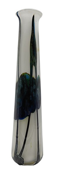 Vaso in vetro incamiciato bianco opalescente e incolore decorato con applicazioni informali policrome nei toni del giallo, blu, rosa e verde. Francia, seconda metà secolo XX. Firmato a punta sotto la base. (h cm 49)